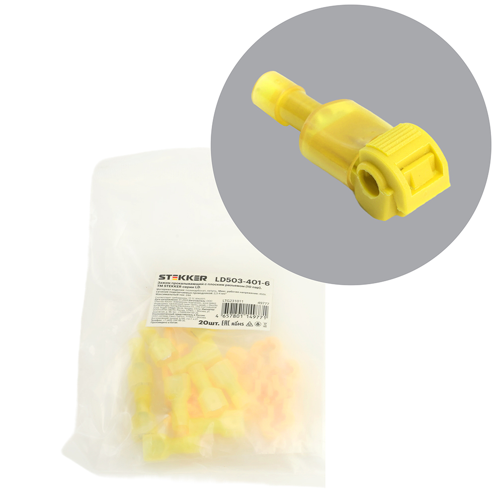LD503-401-6 Зажим прокалывающий с плоским разъемом сеч.2,5-4мм2, желтый (DIY упаковка 20шт -10 пар)