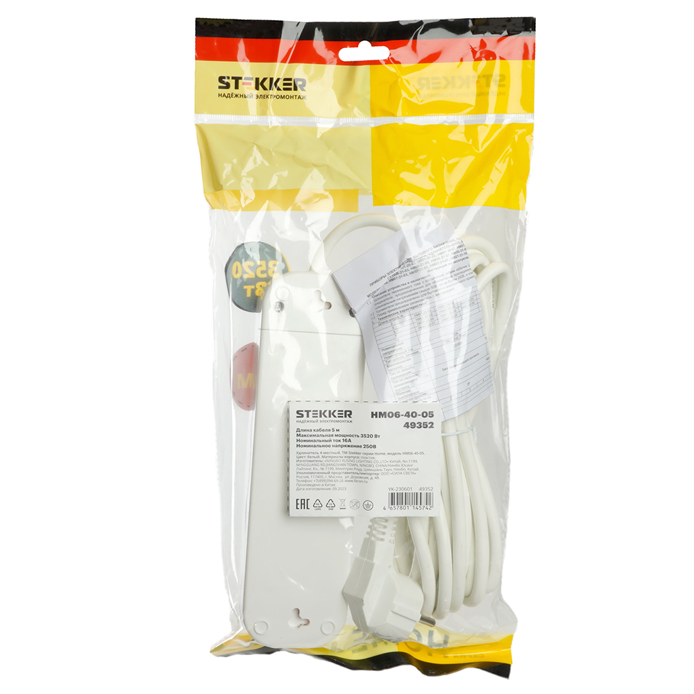 Удлинитель четырехместный c/з STEKKER HM06-40-05 3x1мм2, 5м, серия Home (У10-429), белый
