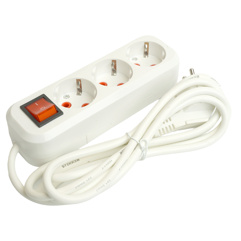 Удлинитель трехместный с/з с выключ. STEKKER HM07-31-02 3x1мм2, 2м, серия Home (У16А-002), белый