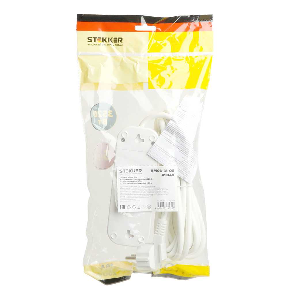 Удлинитель трехместный с/з STEKKER HM06-31-05 3x1мм2, 5м, серия Home (У10-002), белый