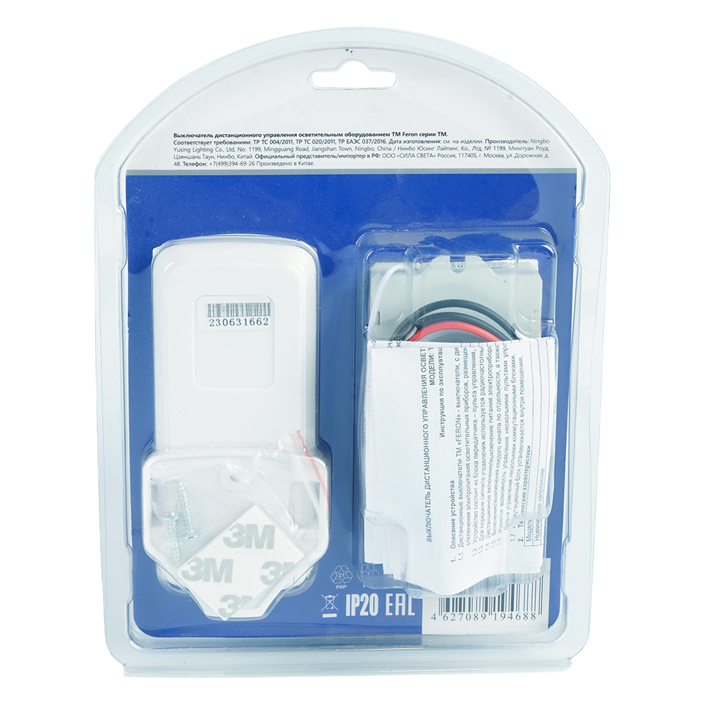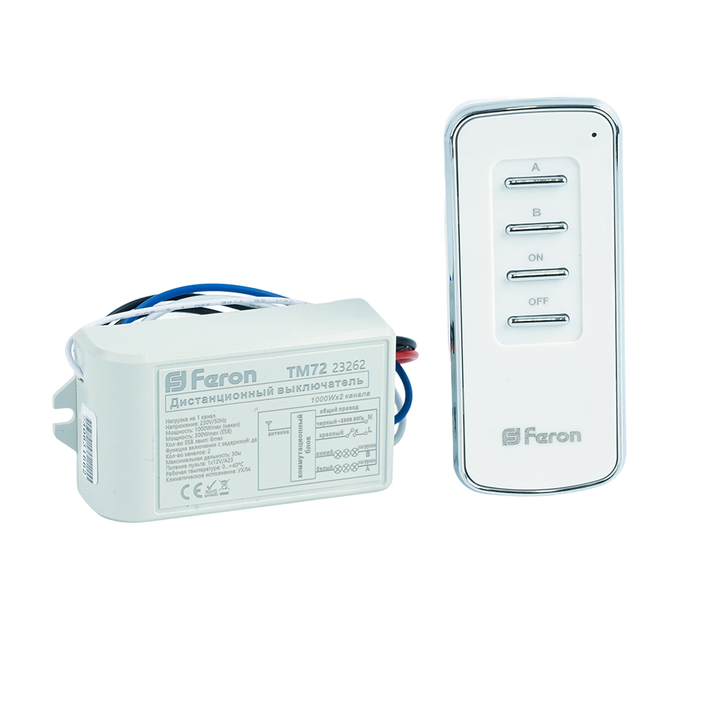 Дистанционный выключатель для светильников (2-х канальный ), FERON TM72, IP20, 230V, 1000W, 300W цвет белый, 90*46*23мм