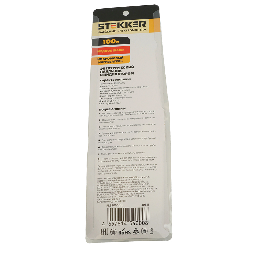 Паяльник с индикатором 100W, нихромовый нагреватель, долговечное жало, 230В, STEKKER PLE301-100
