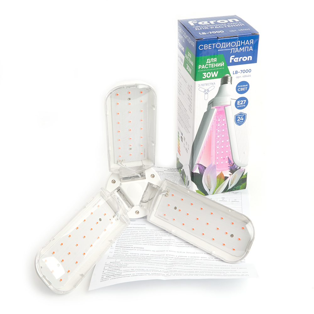 Лампа для растений FERON LB-7000, (лепестковая), 30W 175-265V E27 (розовый), рассеиватель прозрачный угол рассеивания 180°, корпус пластик, 240*80мм