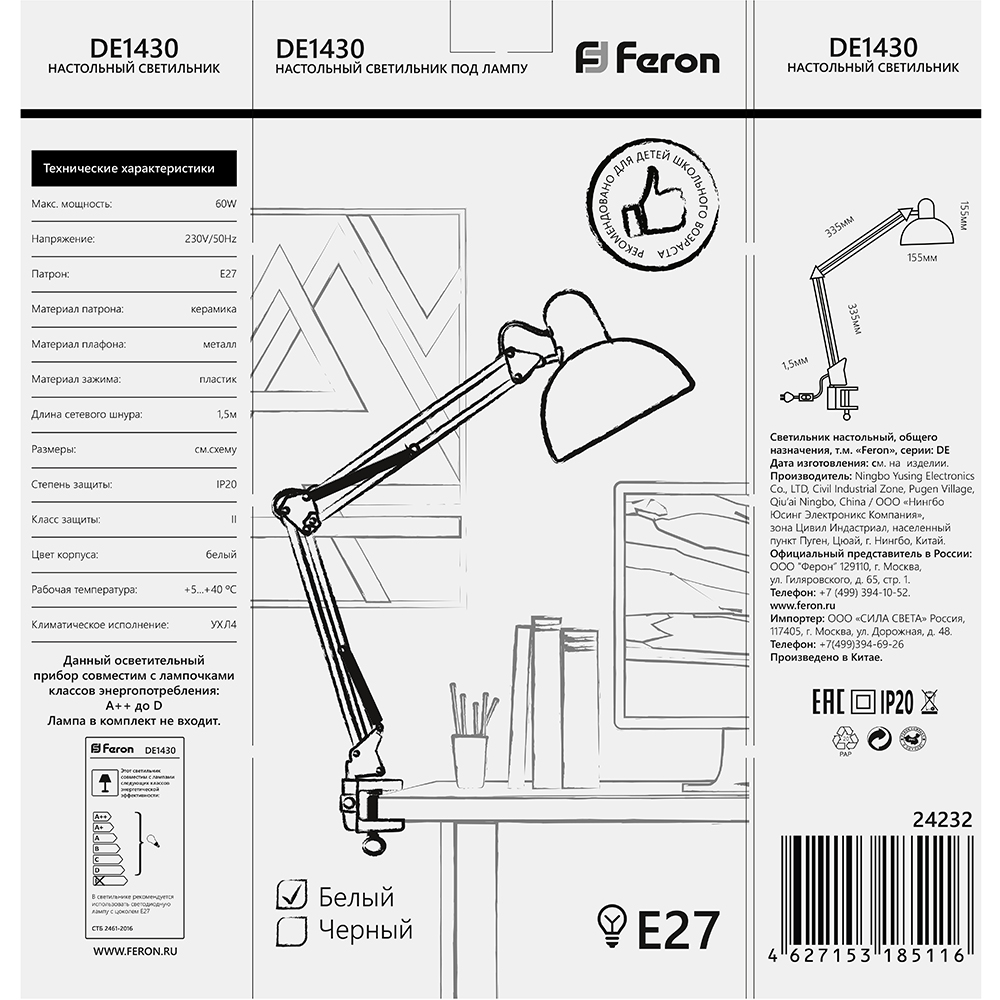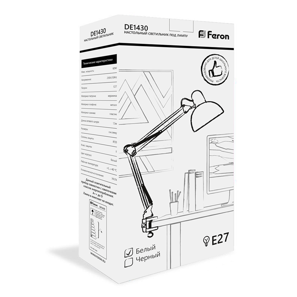 Светильник под лампу Feron DE1430 60W, 230V, патрон E27 на струбцине, белый