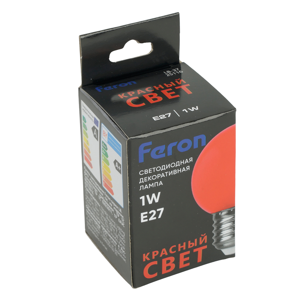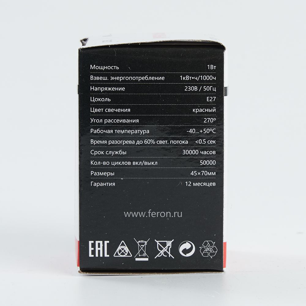 Лампа светодиодная FERON LB-37, G45 (шар), 1W 230V E27 (красный), рассеиватель матовый красный, угол рассеивания 270°, корпус пластик, 70*45мм