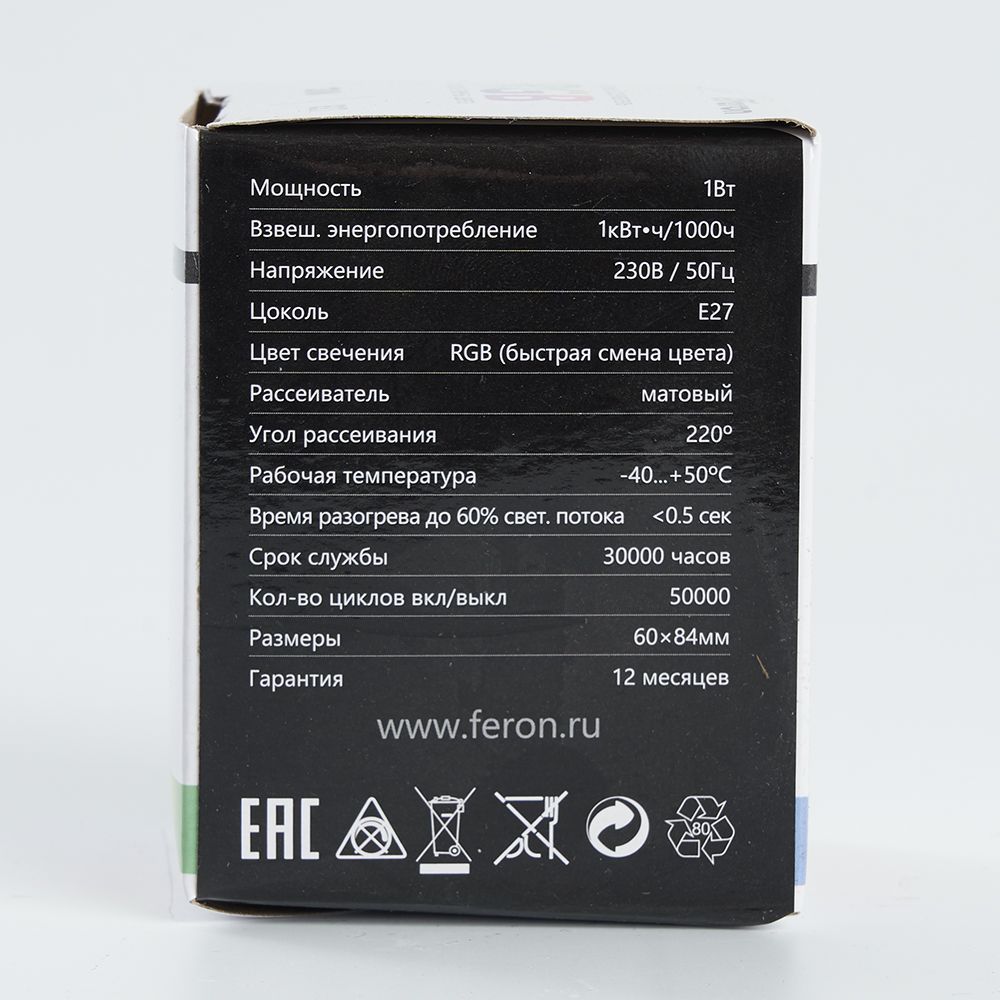 Лампа светодиодная FERON LB-37, G45 (шар), 1W 230V E27 (RGB), рассеиватель матовый угол рассеивания 270°, корпус пластик, 70*45мм