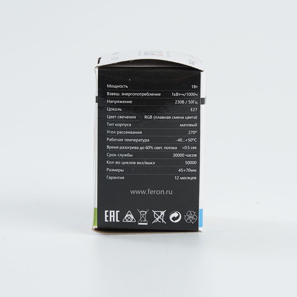 Лампа светодиодная FERON LB-37, G45 (шар), 1W 230V E27 (RGB), рассеиватель матовый угол рассеивания 270°, 70*45мм