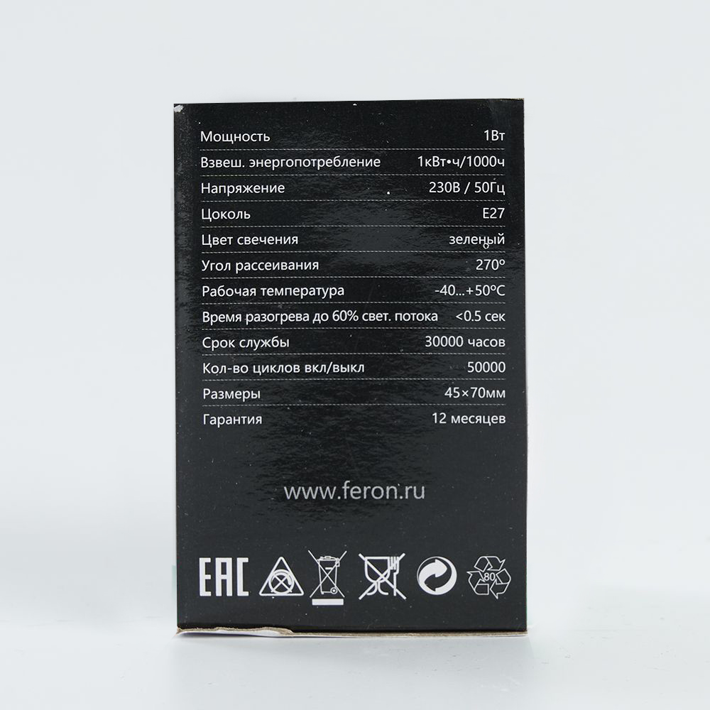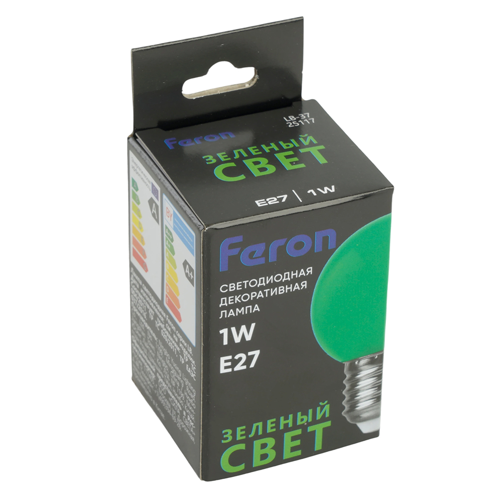 Лампа светодиодная FERON LB-37, G45 (шар), 1W 230V E27 (зеленый), рассеиватель матовый зеленый, угол рассеивания 270°, корпус пластик, 70*45мм
