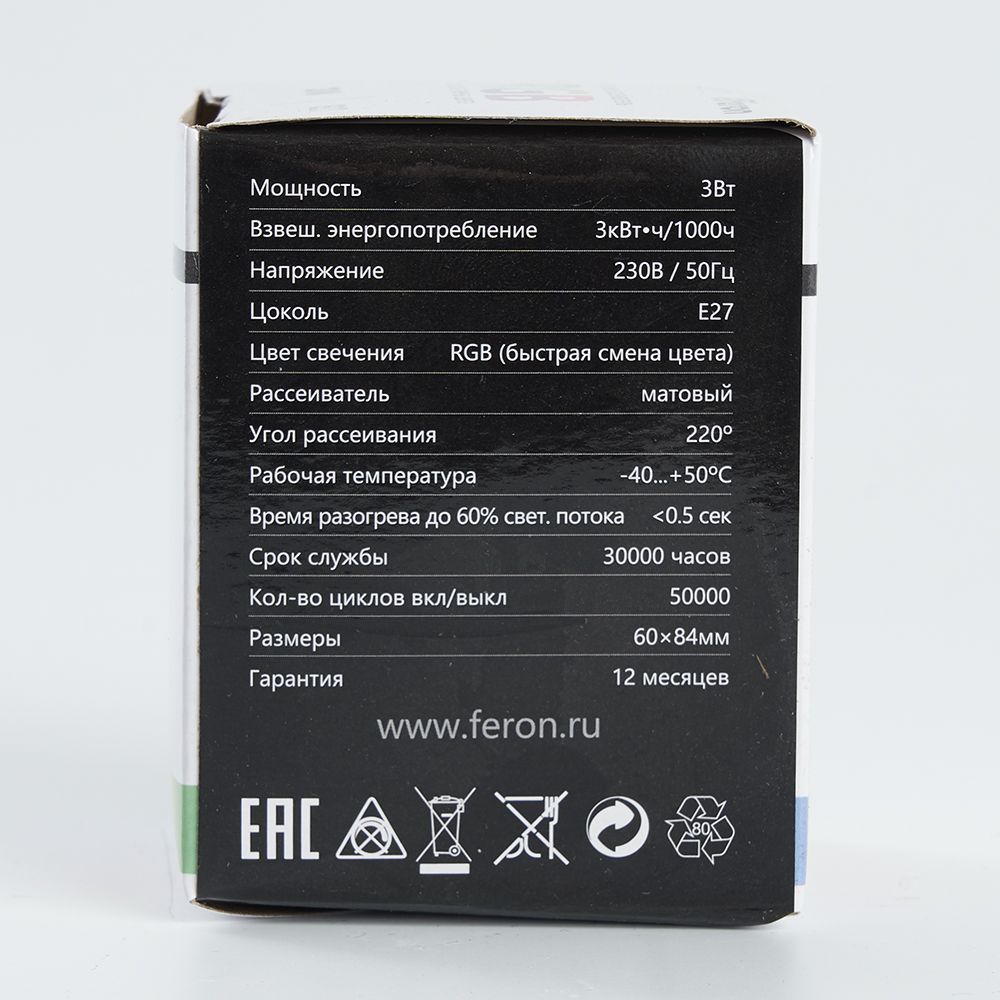 Лампа светодиодная FERON LB-371, G60 (шар), 3W 230V E27 (RGB), рассеиватель матовый угол рассеивания 270°, корпус пластик, 84*60мм