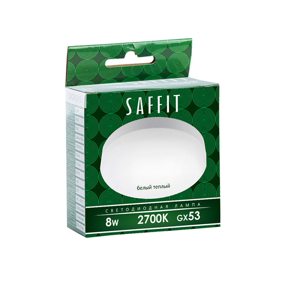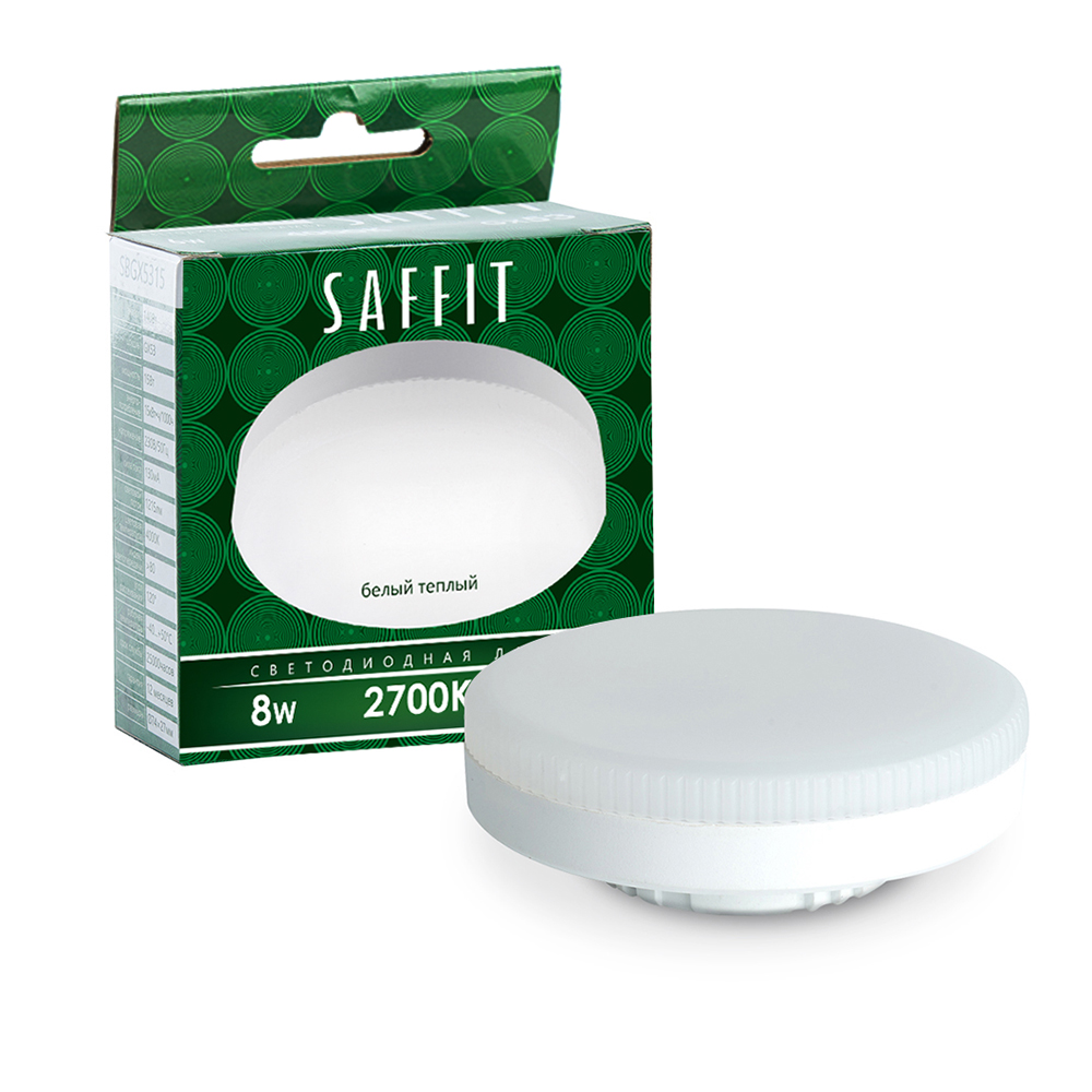 Лампа светодиодная SAFFIT SBGX5308, GX53 (таблетка), 8W 230V GX53 2700К (белый теплый), рассеиватель матовый белый, 680Lm, угол рассеивания 120°, 26*74мм