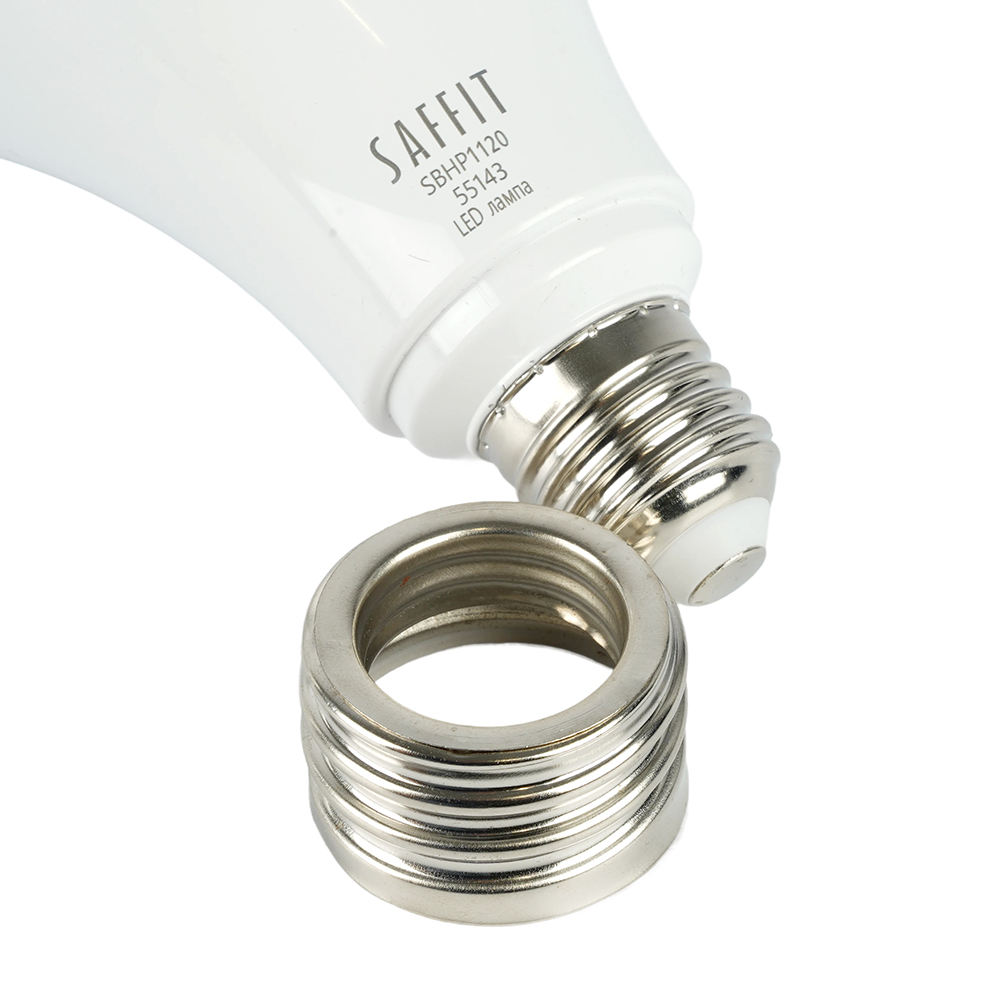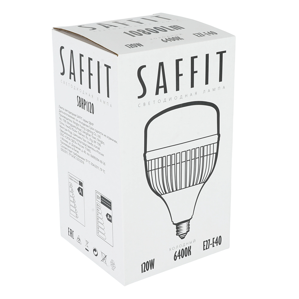 Лампа светодиодная SAFFIT SBHP1120, колба (промышленная), 120W 230V E27-E40 6400К (дневной), рассеиватель матовый белый, 10800Lm, угол рассеивания 220°, корпус пластик, 204*118мм