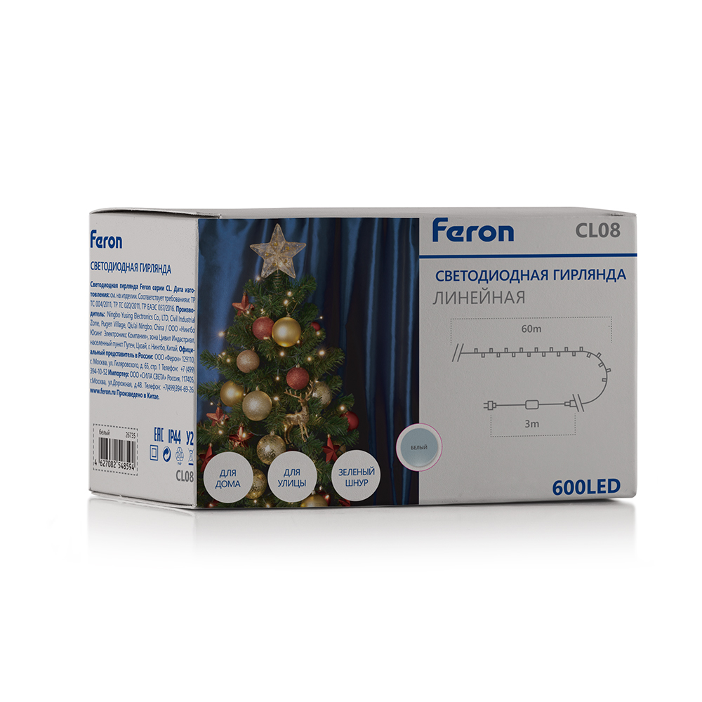 Гирлянда линейная FERON CL08, 600LED, 5000К (белый), статичная (постоянного свечения), 60м+3м зеленый шнур, расстояние между светодиодами 10см, IP44, 36W, от сети последовательное подключение - НЕТ
