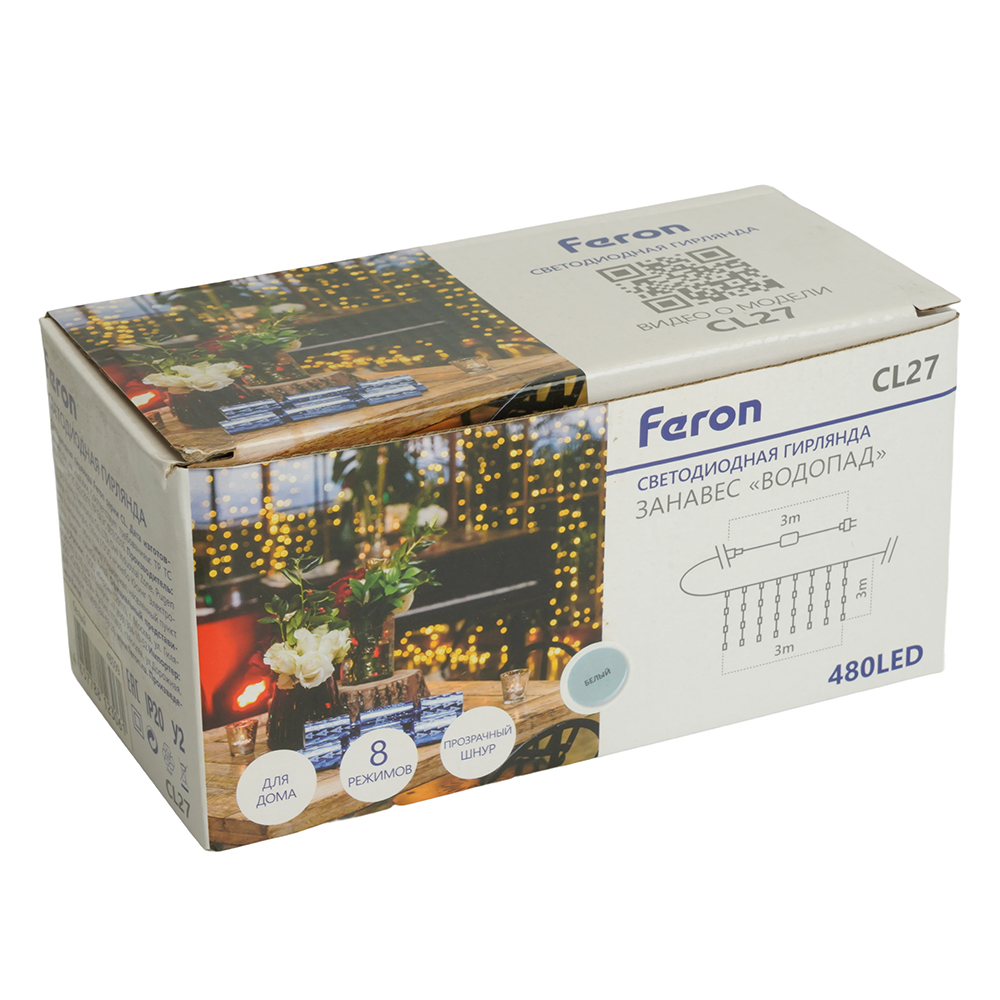 Гирлянда дождь FERON CL27, 480LED, 5000К (белый), настраивается контроллером, 3*3м+3м прозрачный шнур, расстояние между светодиодами 10см, IP20, 24W, от сети последовательное подключение до 3 гирлянд