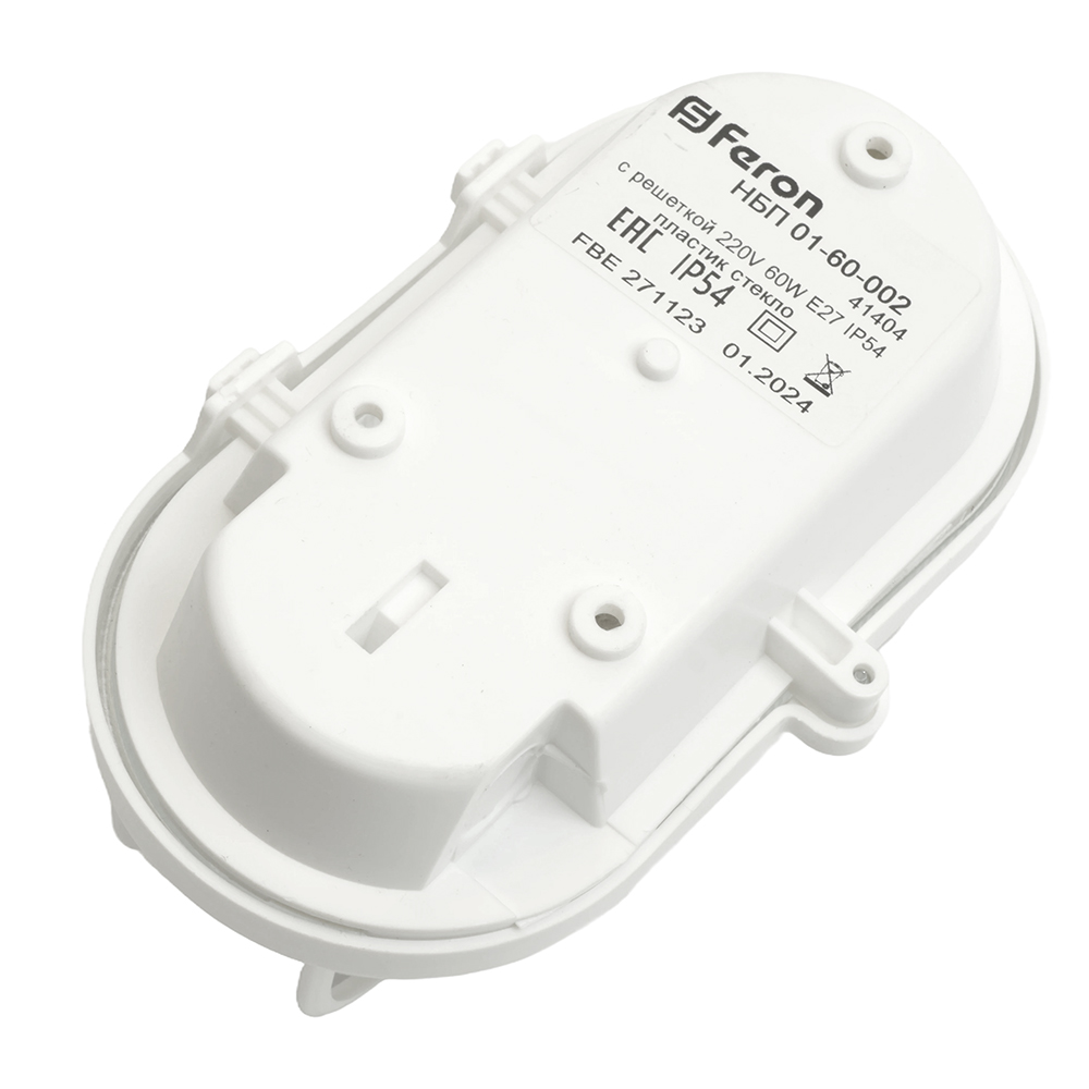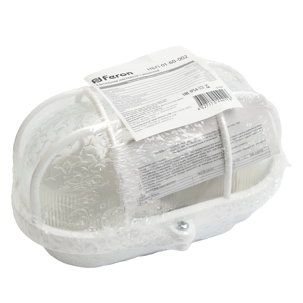 Светильник накладной под лампу, пылевлагозащищённый (НБП) FERON НБП 01-60-002, E27 60W, 220V, IP54, цвет белый, корпус пластик, рассеиватель стекло, 185*120*115