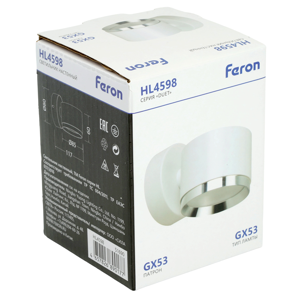 Светильник накладной под лампу, (-) FERON HL4598, GX53 12W, 230V, IP20, цвет белый + хром, корпус алюминий, 117*85*60