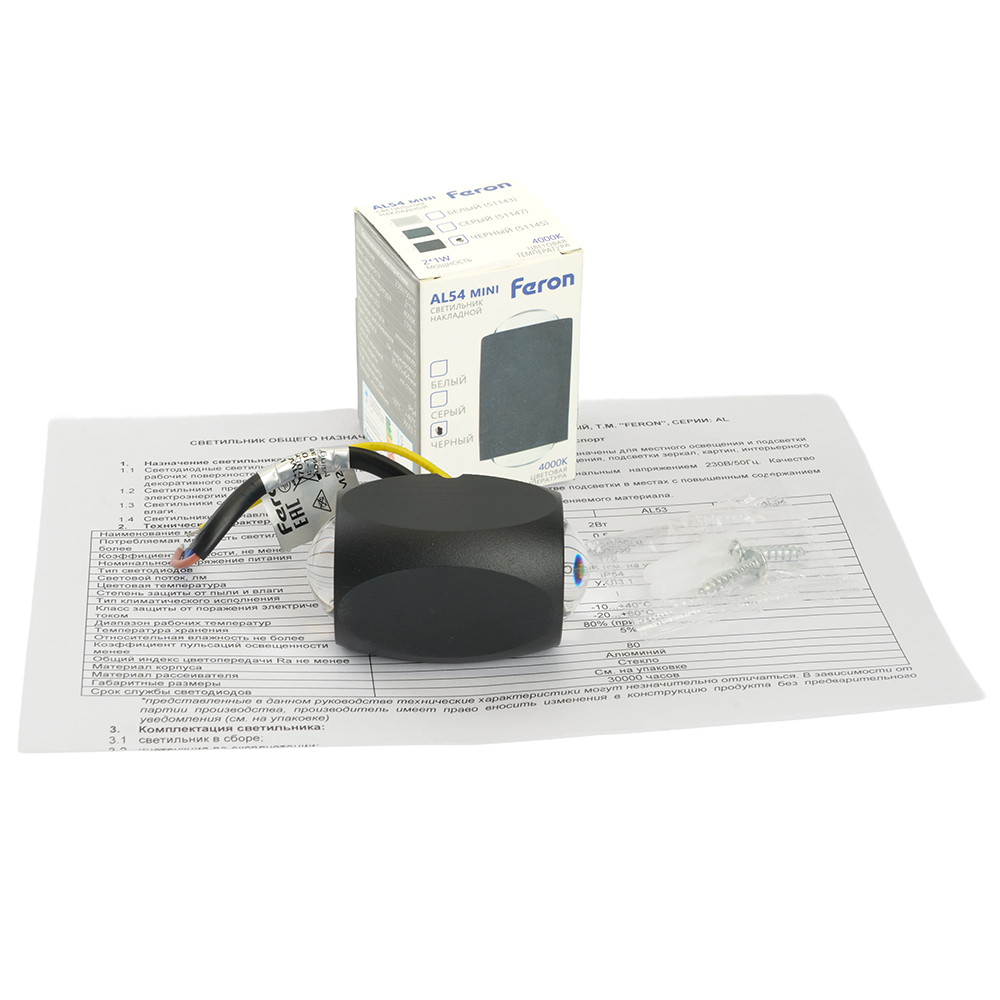 Светильник накладной, (-) FERON AL54, 2*1W, (белый нейтральный), 175-265V, 170Lm, IP54, цвет черный, корпус алюминий, рассеиватель стекло, 35*35*64