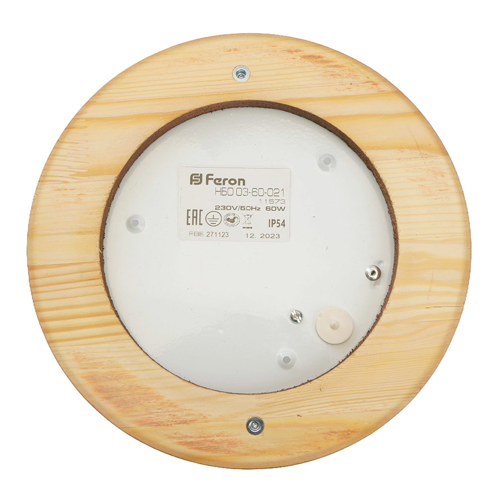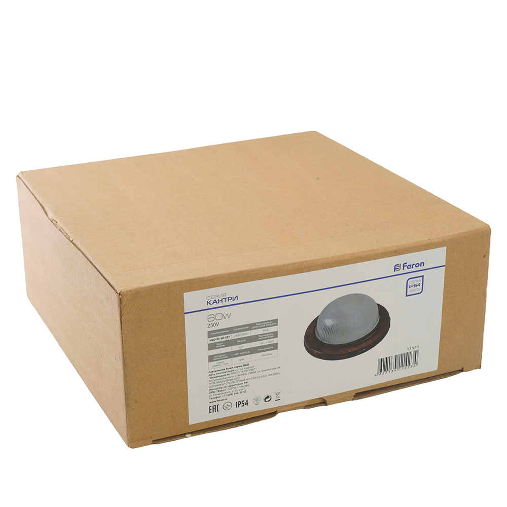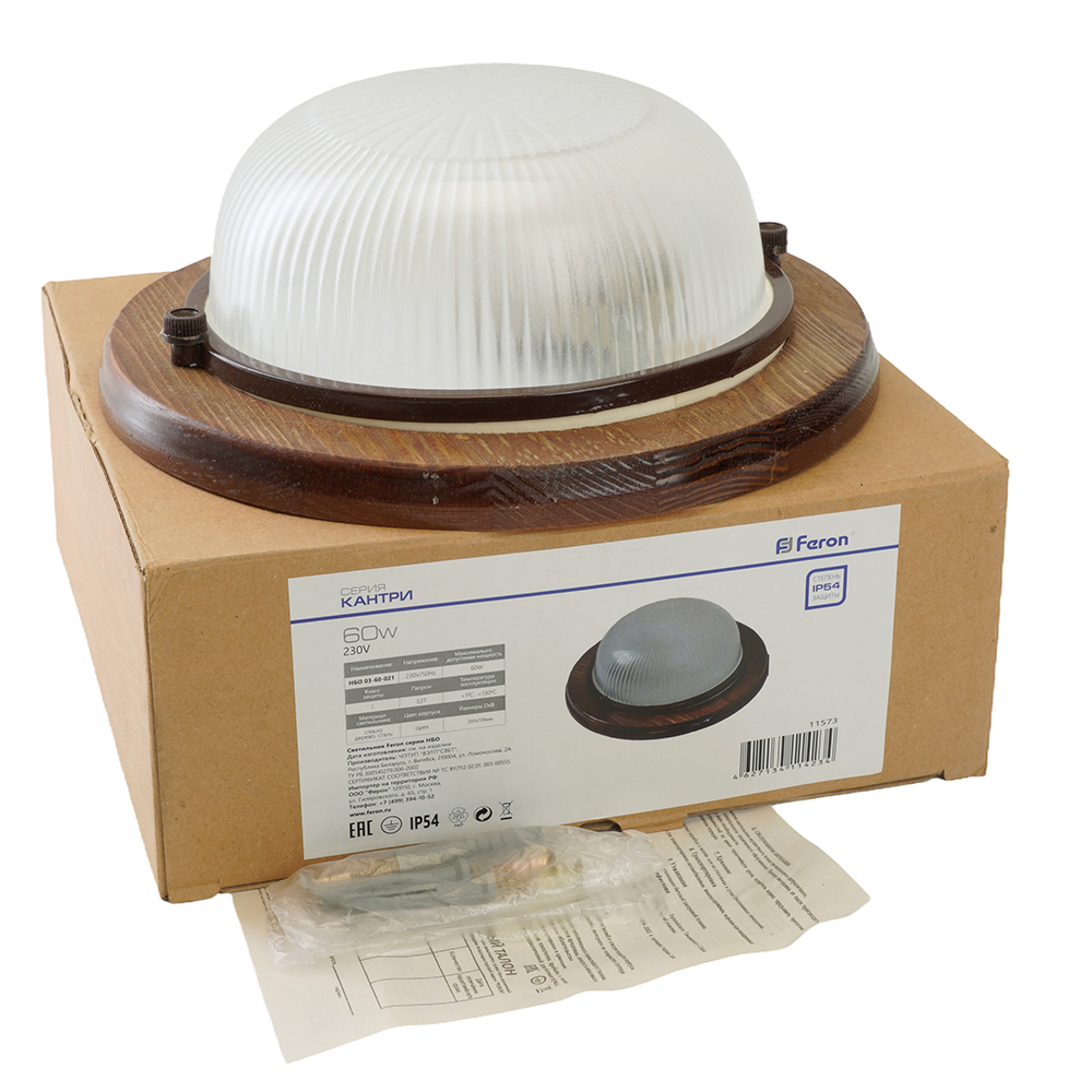 Светильник накладной под лампу, пылевлагозащищённый (НБО) FERON НБО 03-60-021, E27 60W, 220V, IP54, цвет орех, корпус сталь, дерево, рассеиватель стекло, 220*220*84