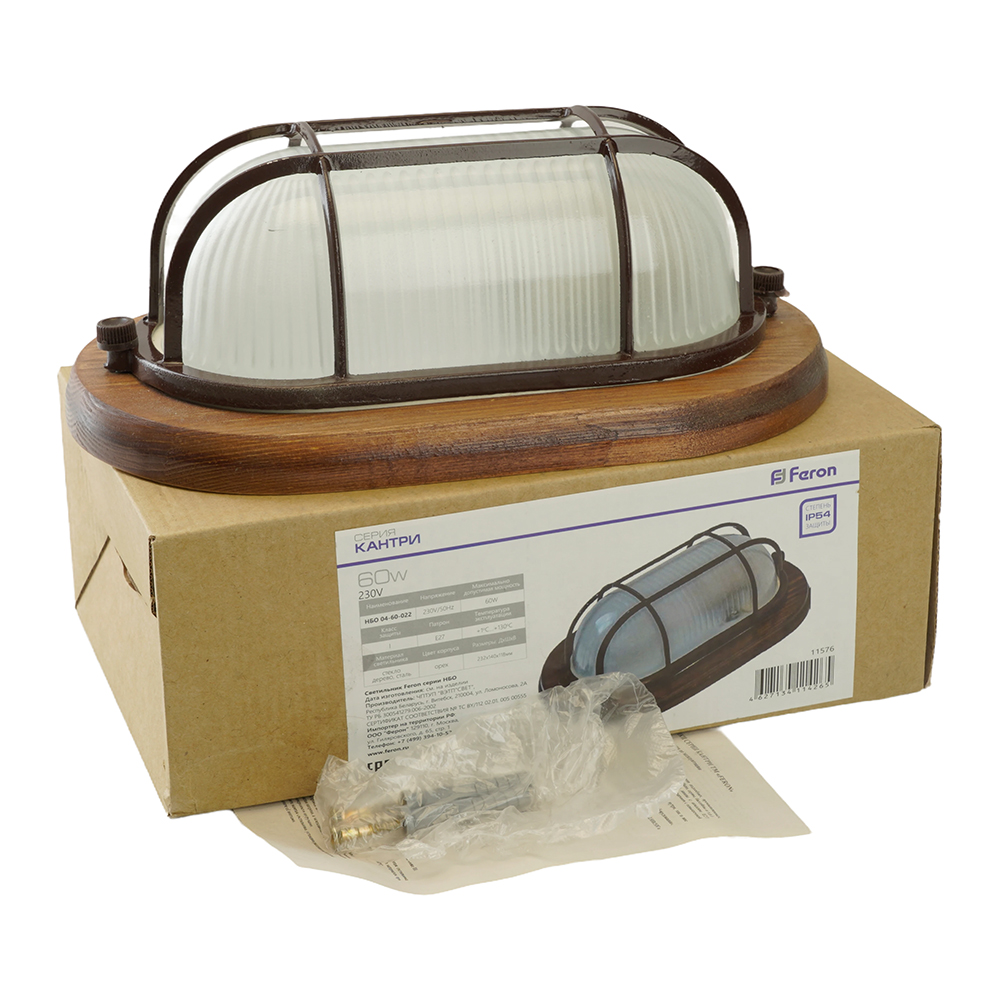 Светильник накладной под лампу, пылевлагозащищённый (НБО) FERON НБО 04-60-022, E27 60W, 220V, IP54, цвет орех, корпус сталь, дерево, рассеиватель стекло, 230*140*85