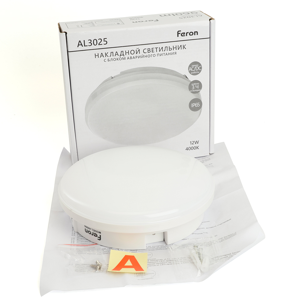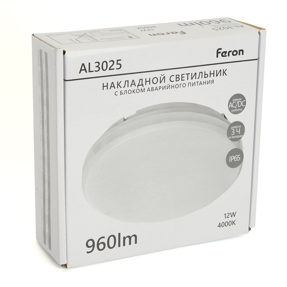 Светильник светодиодный Feron AL3025 с БАП в пластиковом корпусе 12W 4000K IP65 белый
