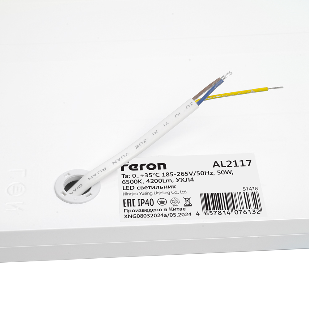 Светильник встраиваемый светодиодный, АРМСТРОНГ (ДВО) FERON AL2117, 50W 6500К (дневной), 185-265V, 4200Lm, IP40, угол рассеивания 120°, цвет белый, корпус штампованная сталь, рассеиватель матовый акриловый полимер, 595*595*22 мм, монтажн.отв. 595*595 мм.