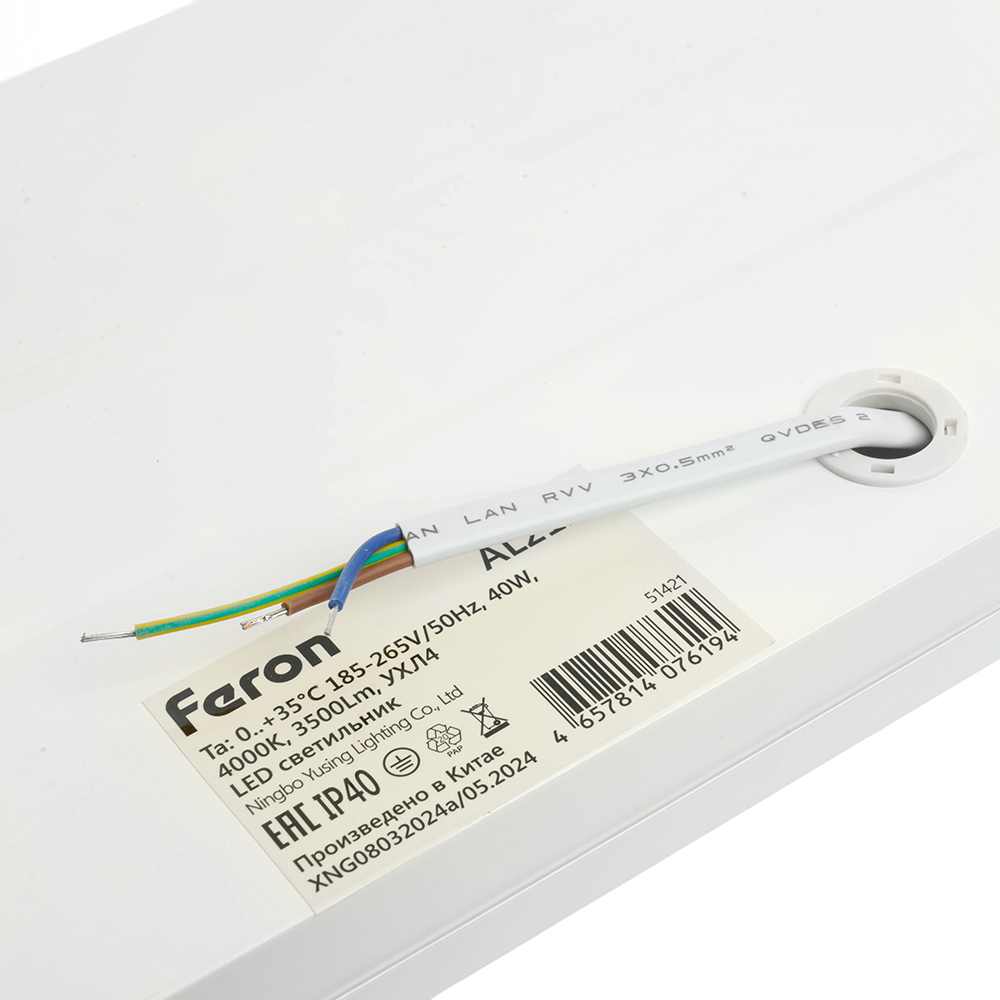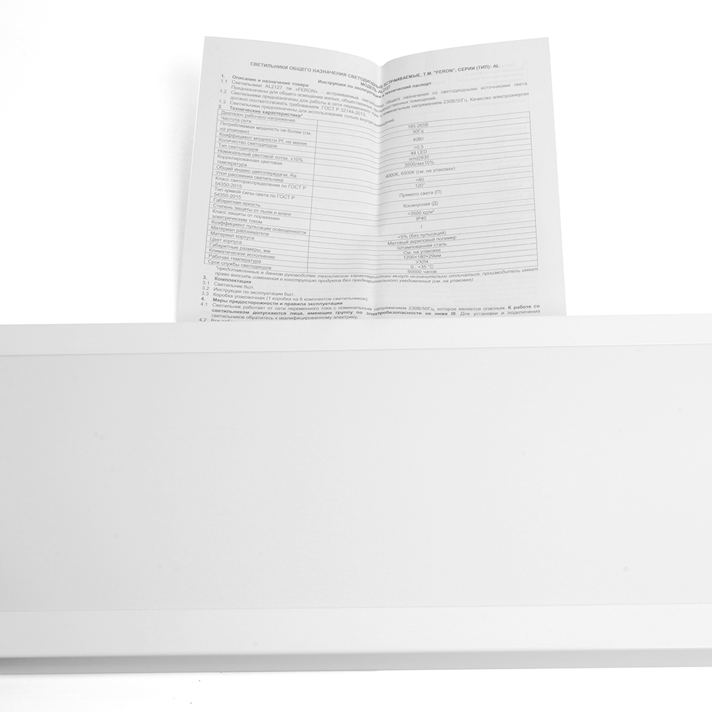 Светильник встраиваемый светодиодный, АРМСТРОНГ (ДВО) FERON AL2127, 40W 6500К (дневной), 185-265V, 3500Lm, IP40, угол рассеивания 120°, цвет белый, корпус штампованная сталь, рассеиватель матовый акриловый полимер, 1200*180*29 мм, монтажн.отв. 1200*180 мм.