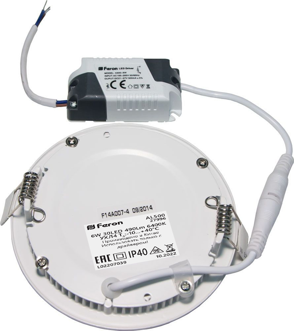 Светильник встраиваемый светодиодный, ультратонкий (ДВО) FERON AL500, 6W 6400К (дневной), 175-265V, 490Lm, IP40, угол рассеивания 120°, цвет белый, корпус алюминий, рассеиватель матовый акриловый полимер, 120*120*18 мм, монтажн.отв. 105*105 мм.