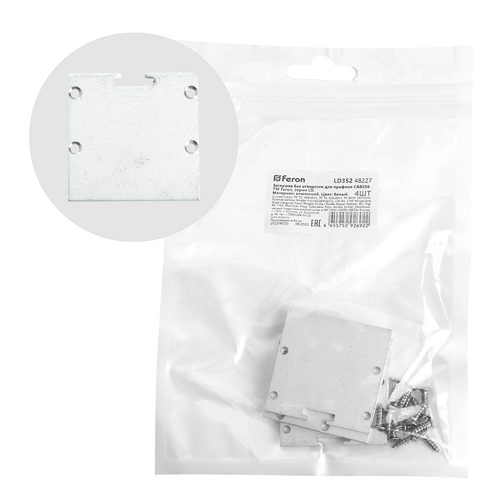 Заглушка для профиля FERON LD352 «без отверстия», цвет серебро, в комплекте 4 шт, 39*2*39мм