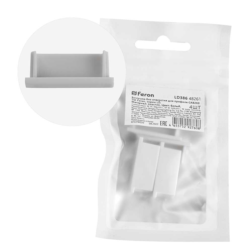 Заглушка для профиля FERON LD386 «без отверстия», цвет белый, в комплекте 4 шт, 23*6*9мм