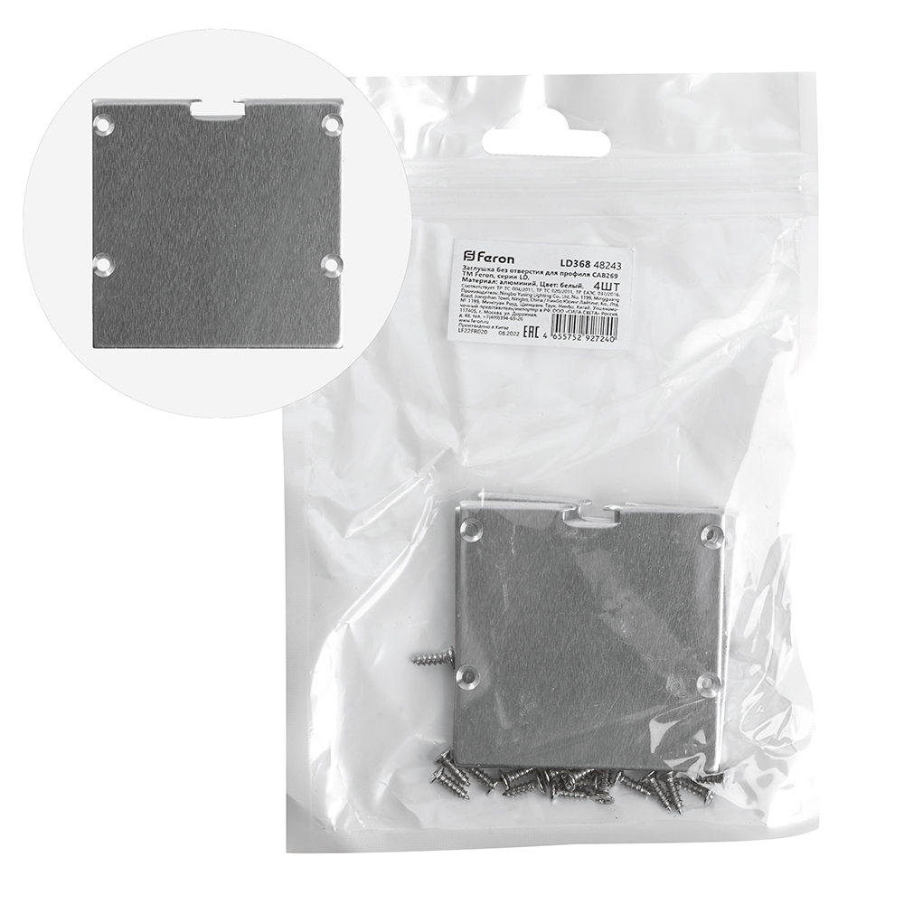 Заглушка для профиля FERON LD368 «без отверстия», цвет серебро, в комплекте 4 шт, 50*2*50мм