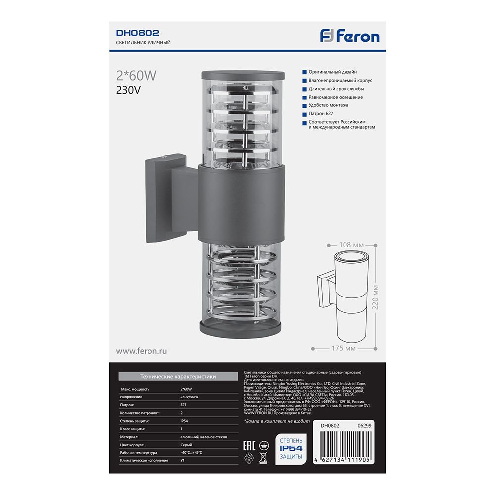 Светильник садово-парковый Feron DH0802, на стену вверх/вниз, 2*E27 230V, серый