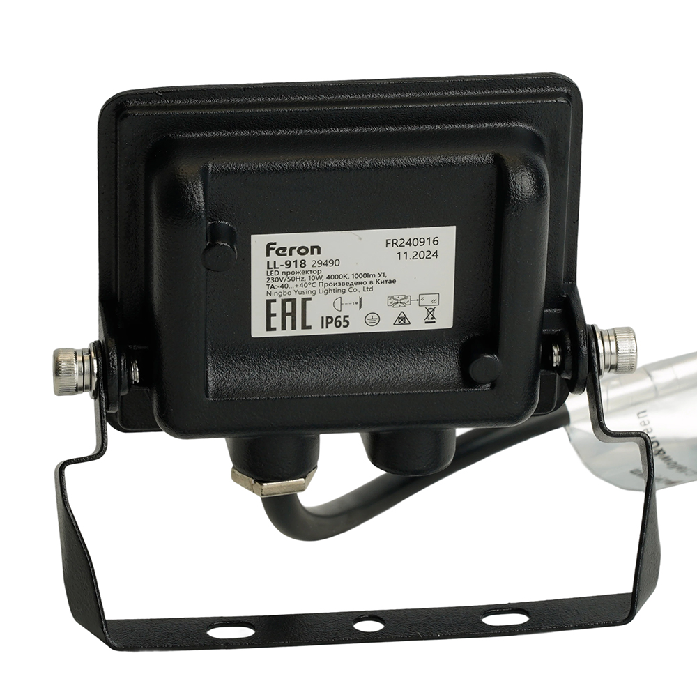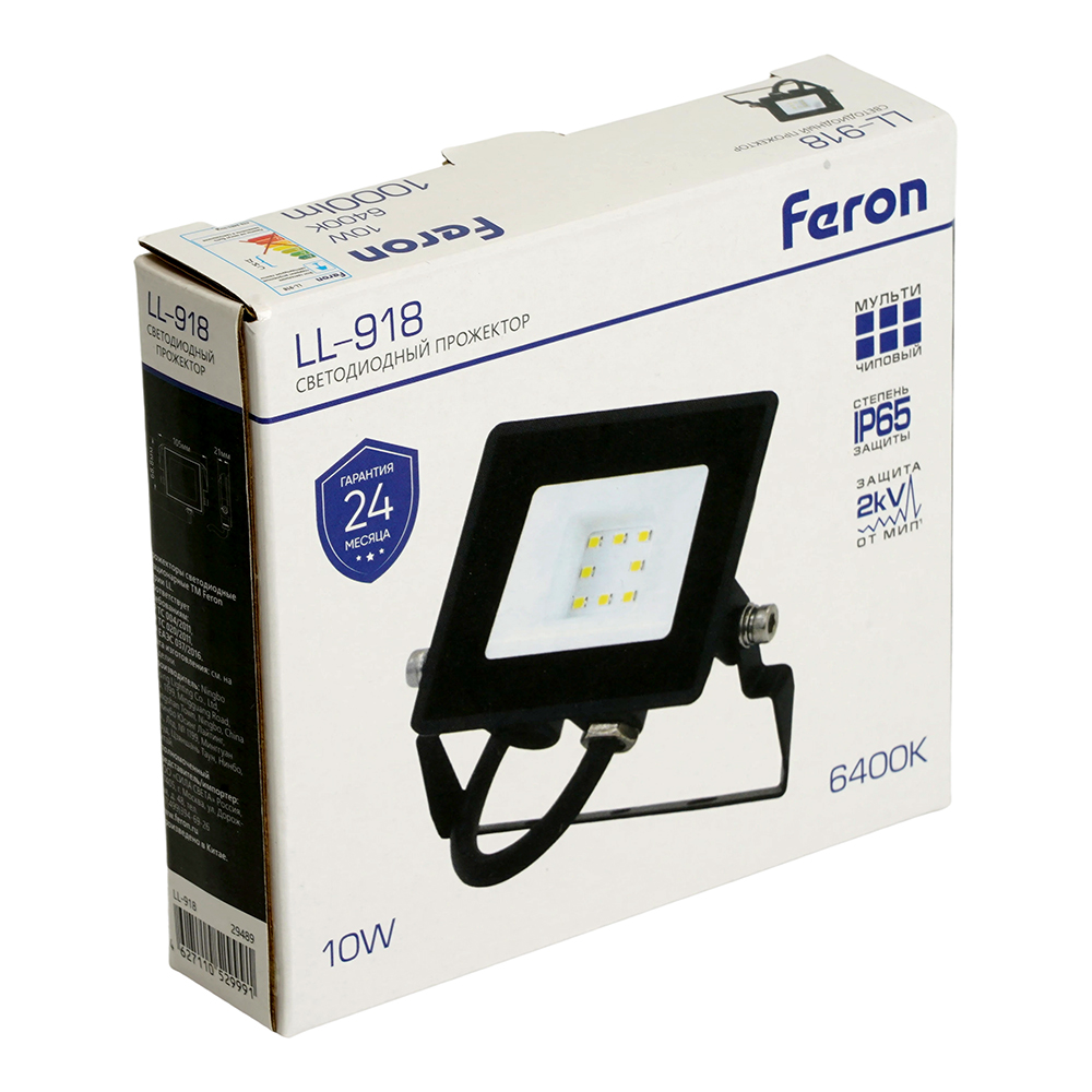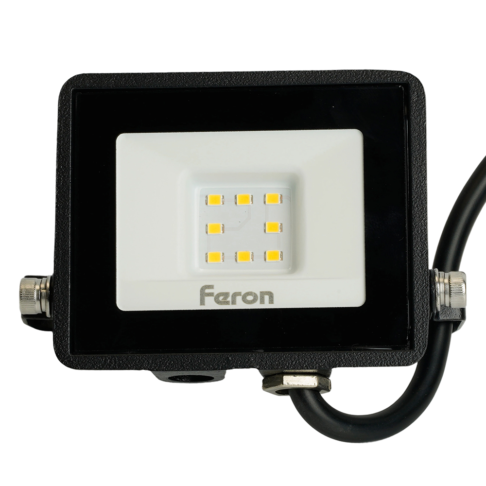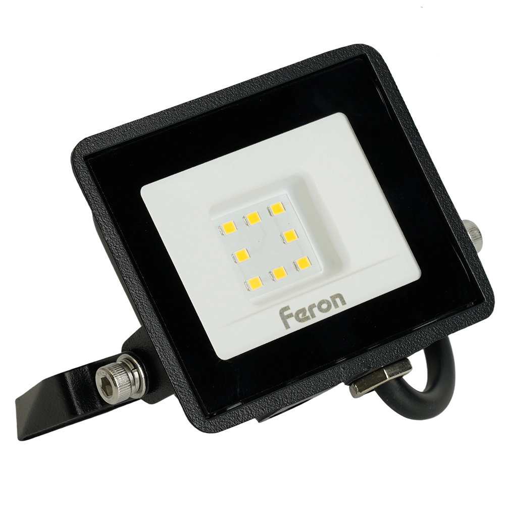 Прожектор светодиодный многоматричный с монтажным креплением на кронштейн, (ДО) FERON LL-918, 10W, 6400К (холодный белый), 230V/50Гц, 1000Lm, IP65, угол рассеивания 120°, 8*SMD2835, раб.t -40°C - +40°C, цвет чёрный, корпус алюминий литой под давлением + стекло, 105*88*21 мм