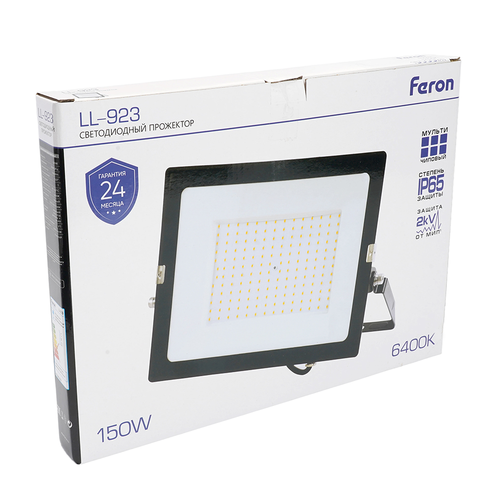 Прожектор светодиодный многоматричный с монтажным креплением на кронштейн, (ДО) FERON LL-923, 150W, 6400К (холодный белый), 230V/50Гц, 15000Lm, IP65, угол рассеивания 120°, 168*SMD2835, раб.t -40°C - +40°C, цвет чёрный, корпус алюминий литой под давлением + стекло, 330,5*246,6*32 мм
