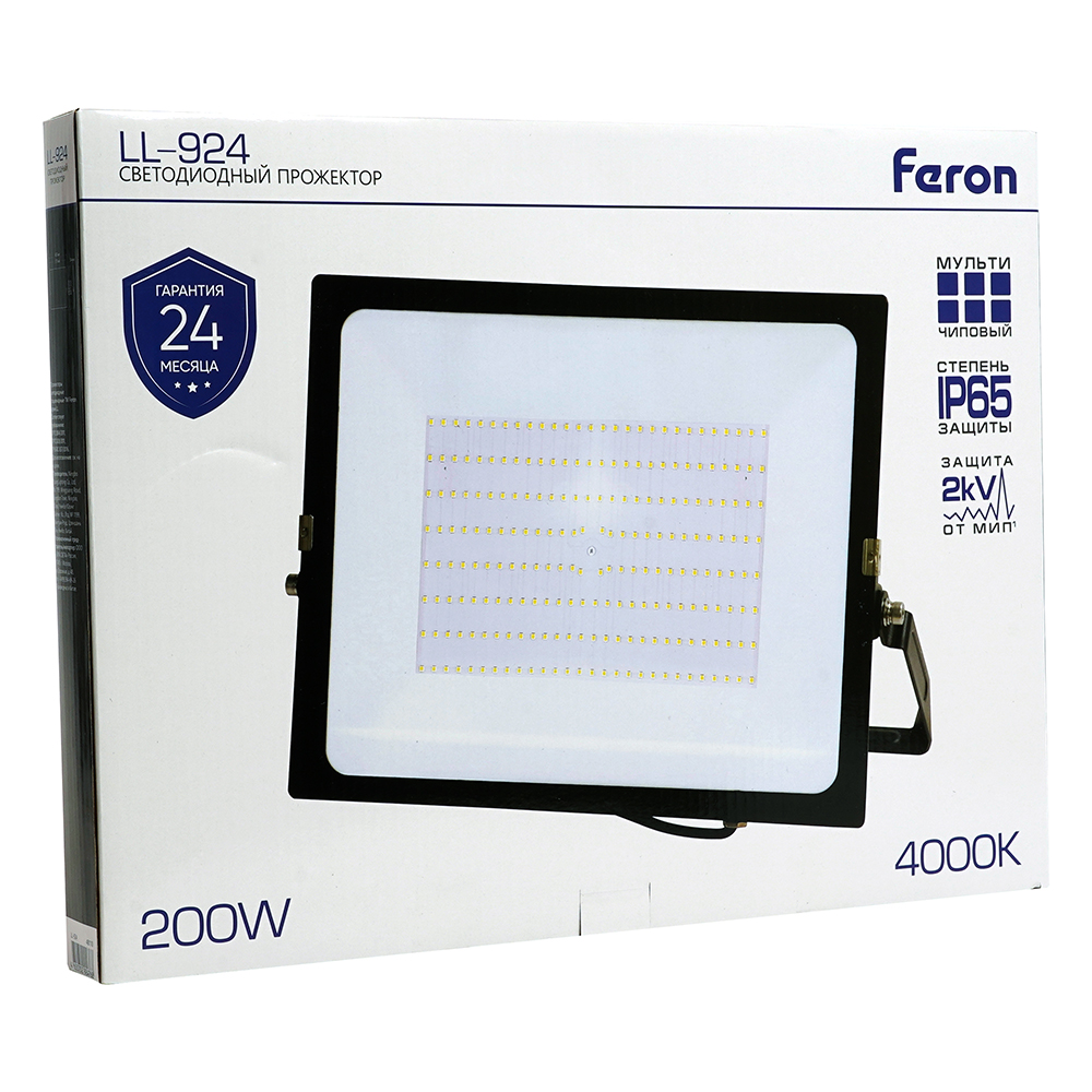 Прожектор светодиодный многоматричный с монтажным креплением на кронштейн, (ДО) FERON LL-924, 200W, 4000К (белый), 230V/50Гц, 20000Lm, IP65, угол рассеивания 120°, 224*SMD2835, раб.t -40°C - +40°C, цвет чёрный, корпус алюминий литой под давлением + стекло, 407*307*34 мм