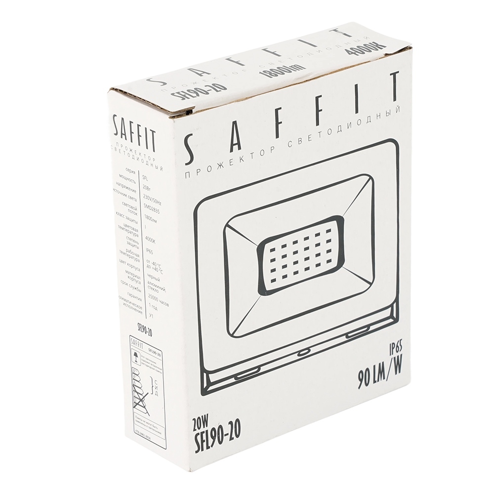 Прожектор светодиодный многоматричный с монтажным креплением на кронштейн, (ДО) SAFFIT SFL90-20, 20W, 4000К (белый), 230V/50Гц, 1800Lm, IP65, угол рассеивания 120°, 20*SMD2835, раб.t -40°C - +40°C, цвет черный, корпус алюминий литой под давлением + стекло, 74*74*25,2 мм