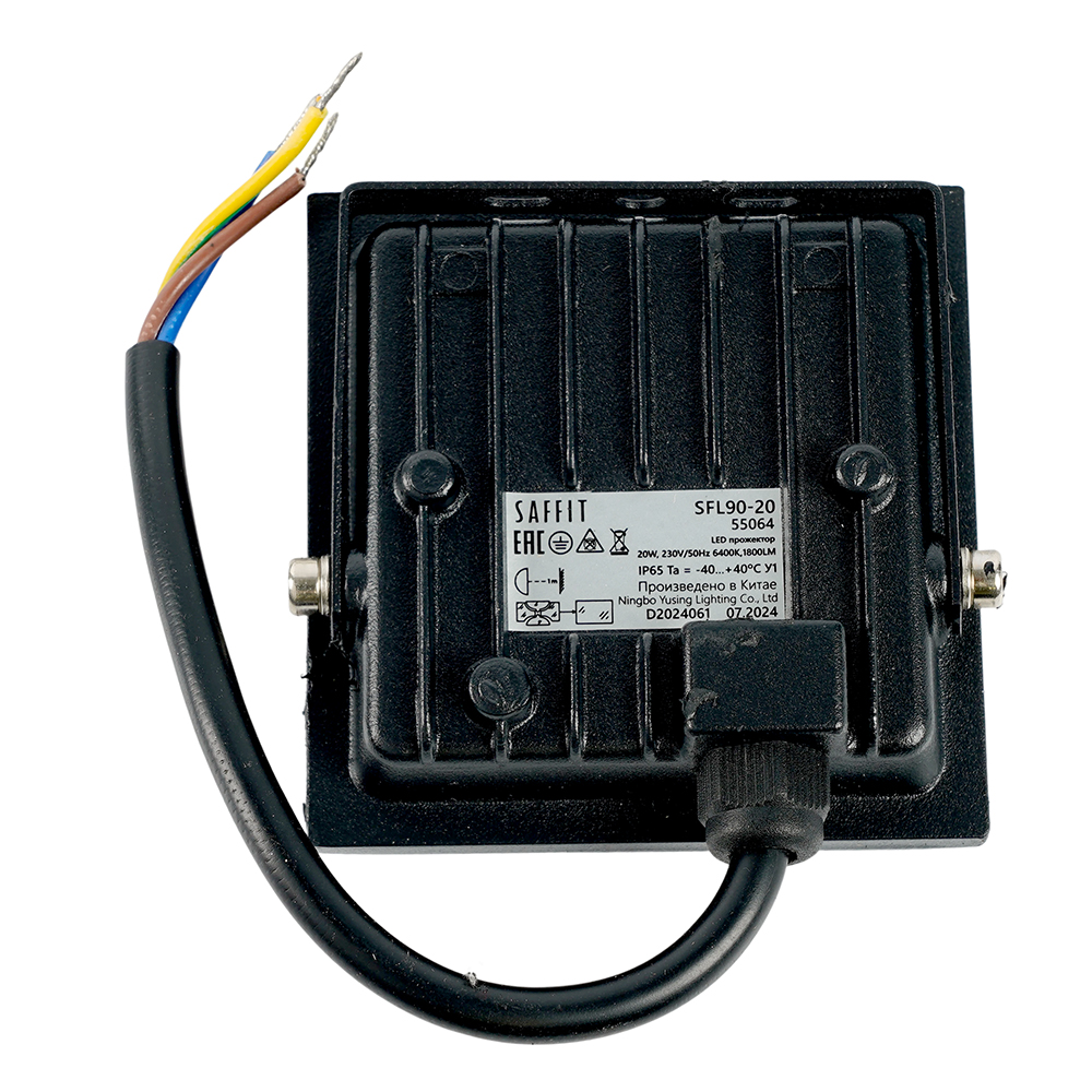 Прожектор светодиодный многоматричный с монтажным креплением на кронштейн, (ДО) SAFFIT SFL90-20, 20W, 6400К (дневной), 230V/50Гц, 1800Lm, IP65, угол рассеивания 120°, 20*SMD2835, раб.t -40°C - +40°C, цвет черный, корпус алюминий литой под давлением + стекло, 74*74*25,2 мм