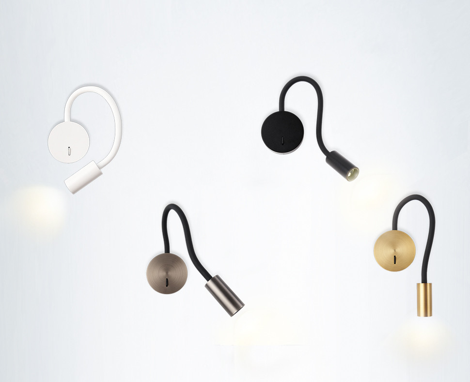 Светильник представлен в четырех цветах: белый, черный, латунь и темная сталь.