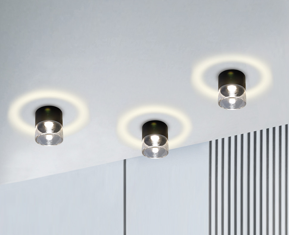 Потолочные светодиодные светильники из металла и поликарбоната. Представлены в черном и белом цвете. На потолке создают декоративный световой ореол, в комплекте светодиодный модуль с цветовой температурой 3000K.