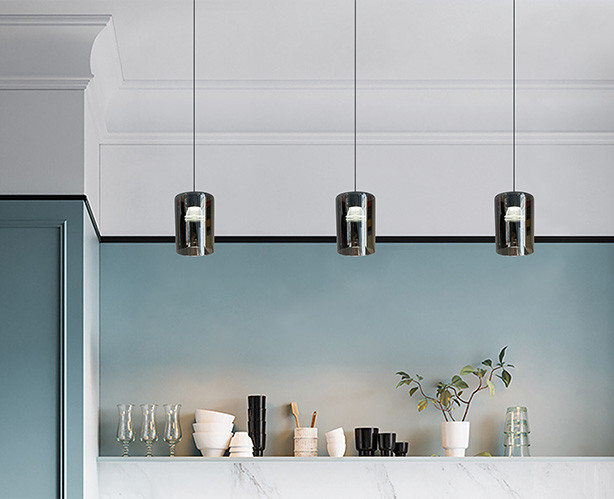 Модный подвесной светильник со светодиодным модулем. Оригинальный плафон из дымчатого стекла способствует формированию четкого светового пятна, что позволяет выделить необходимые зоны освещения. Отлично подходит для освещения барных стоек в кафе и ресторанах, зоны ресепшен, а также создания световых акцентов в жилых пространствах.