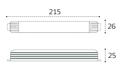 Габаритный размер блока питания - 215 х 26 мм h - 25 мм