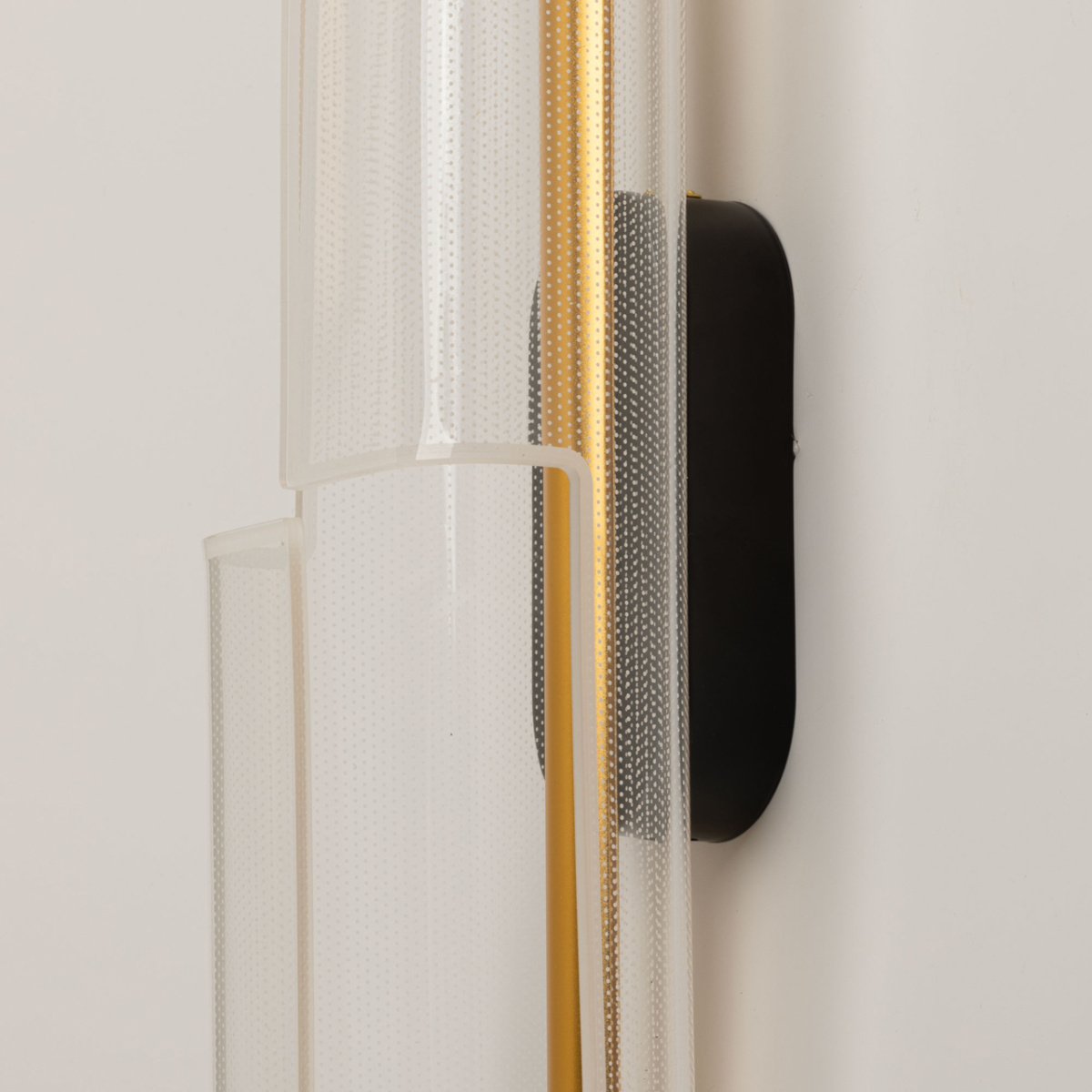 Металлический корпус настенного бра окрашен в черный цвет. Корпус плафона выполнен из сплава алюминия и окрашен в цвет золота. Настенное бра декорировано изящным элементом из прозрачного акрила с точечным рисунком.