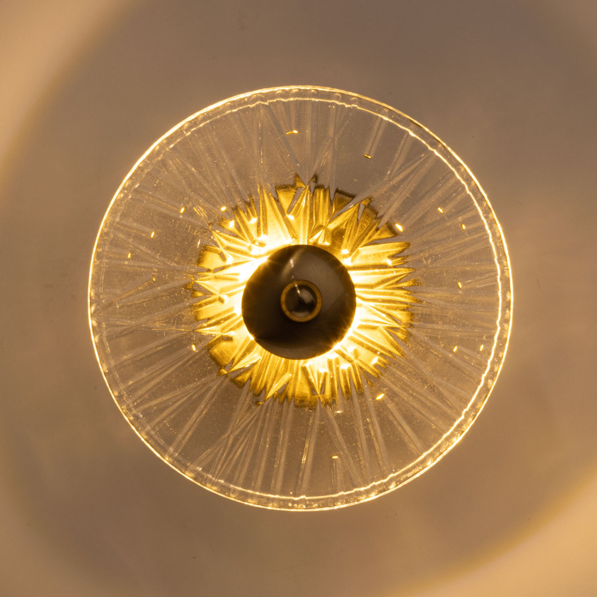 Металлическое основание настенного бра гальванизировано в цвет латуни. Плафон выполнен из прозрачного стекла с рельефной текстурой.