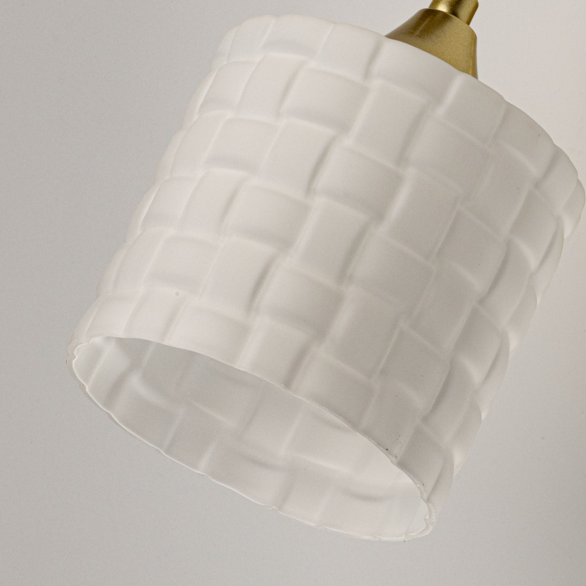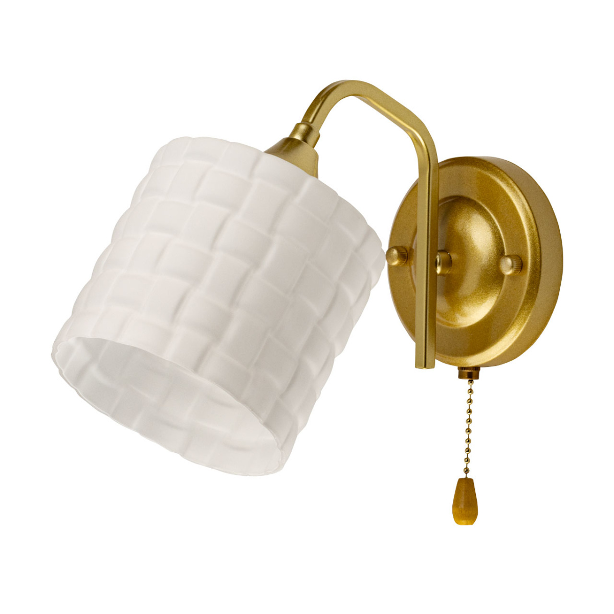 Металлическое основание бра окрашено в цвет золота. Стеклянный плафоны отлит в сложную форму и окрашен в белый цвет.