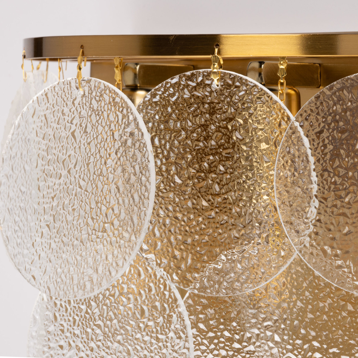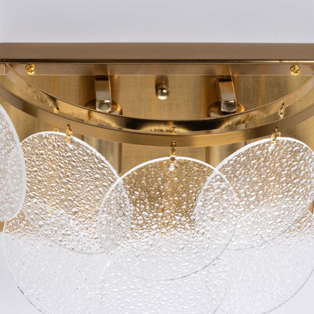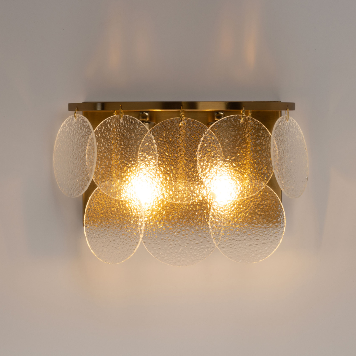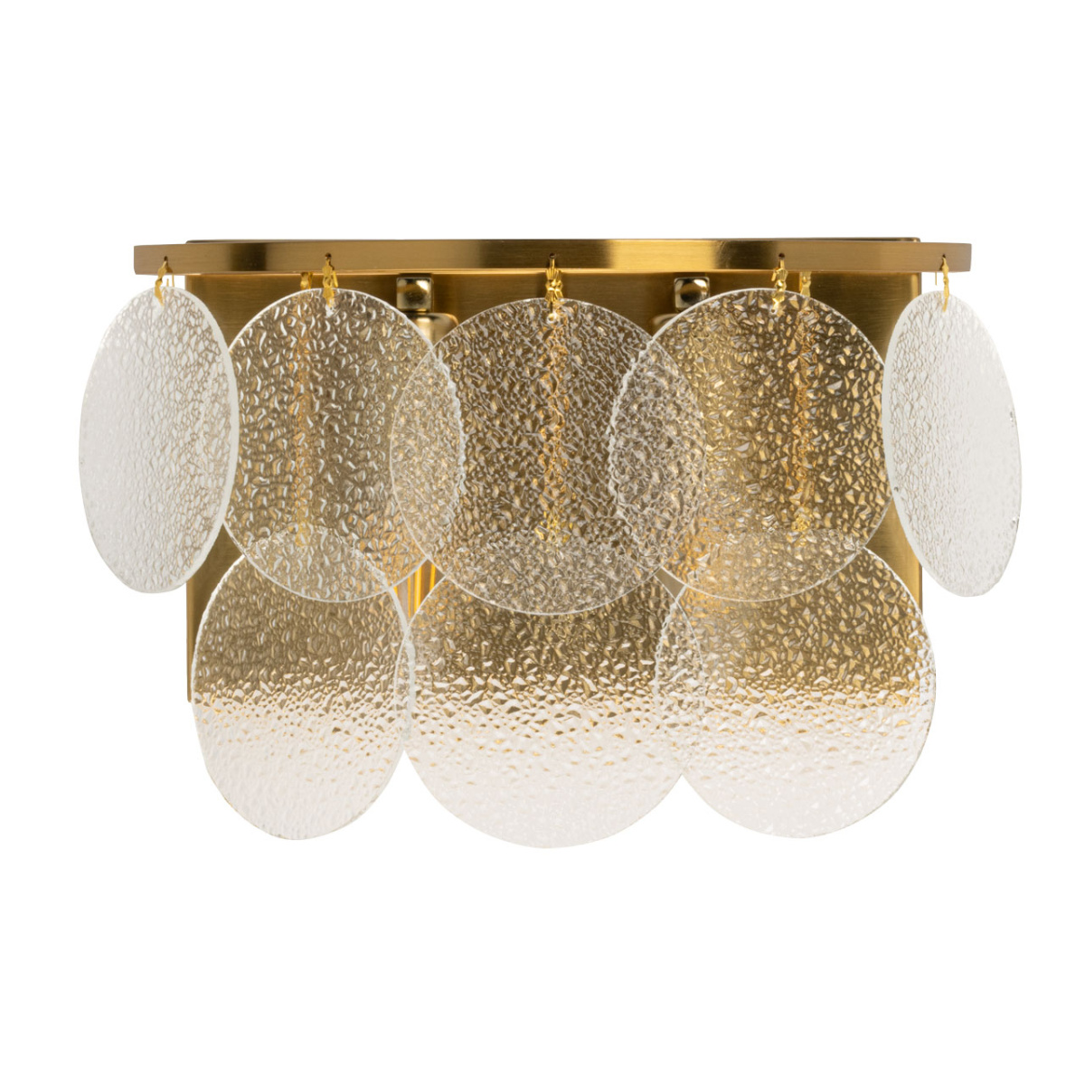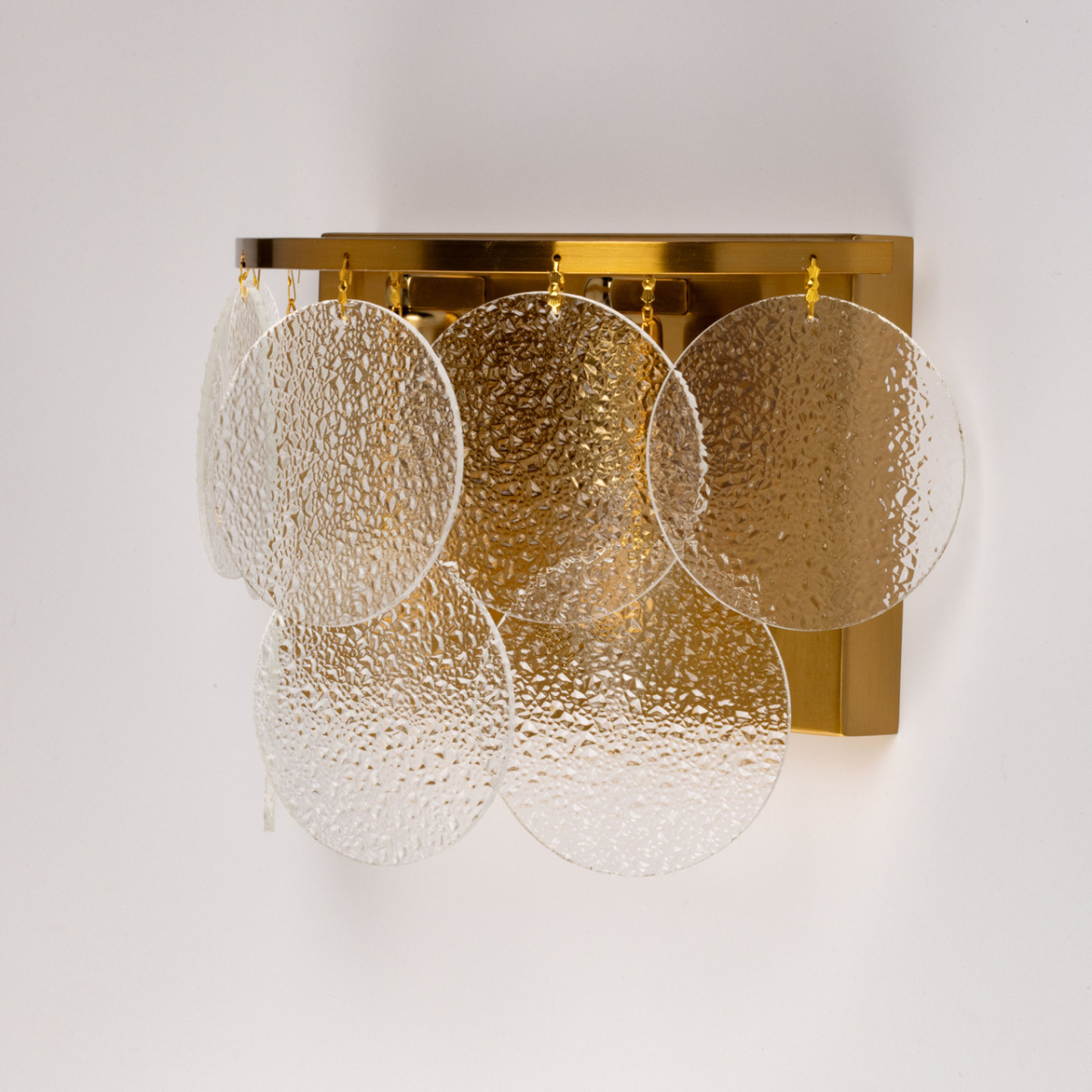 Металлическое основание настенного бра гальванизировано в цвет латуни. Настенное бра декорирован подвесками из фактурного полупрозрачного стекла.