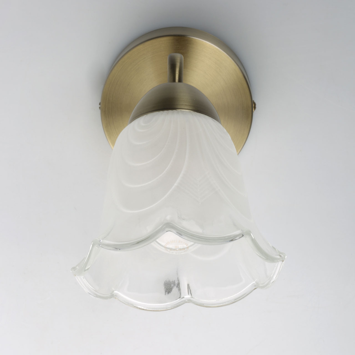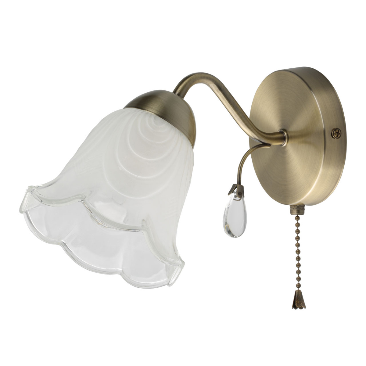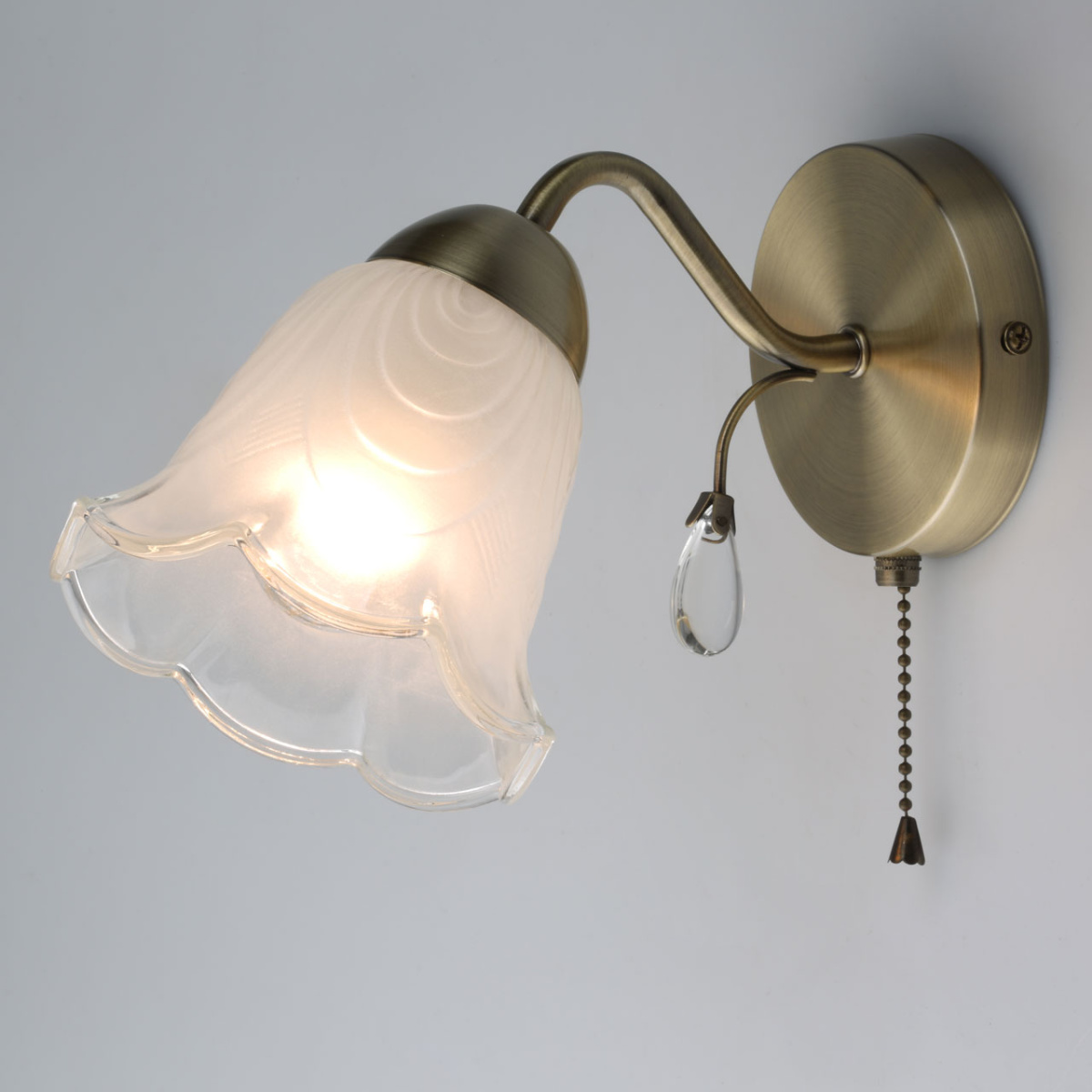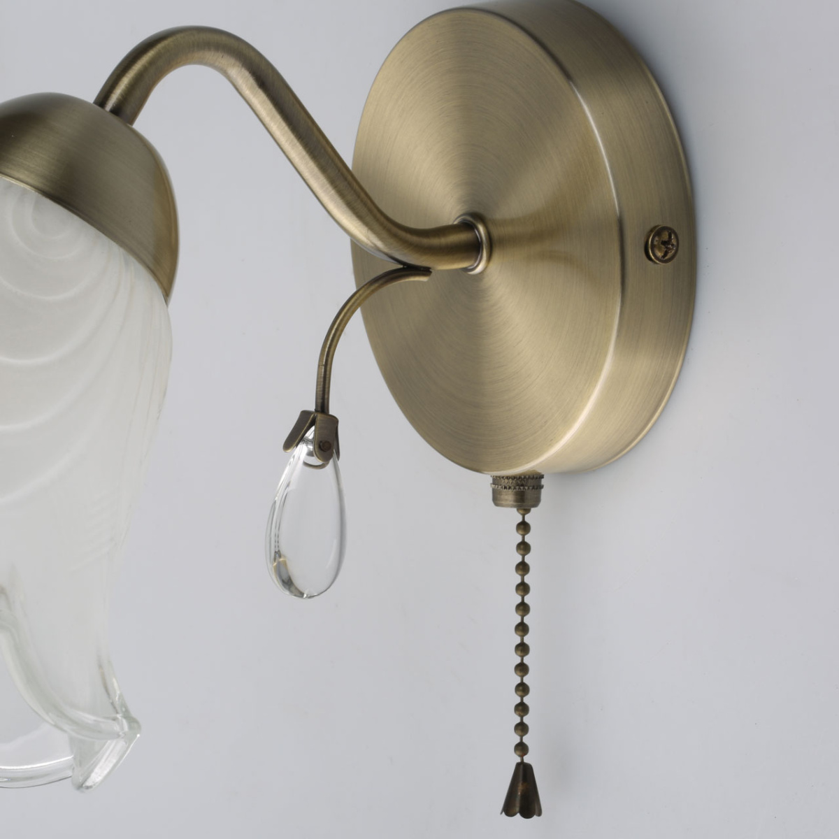 Металлическое основание настенного бра гальванизировано в цвет античной бронзы. Стеклянный плафон отлит в сложную форму и матирован. Бра декорировано хрустальным стеклом миндальной формы.