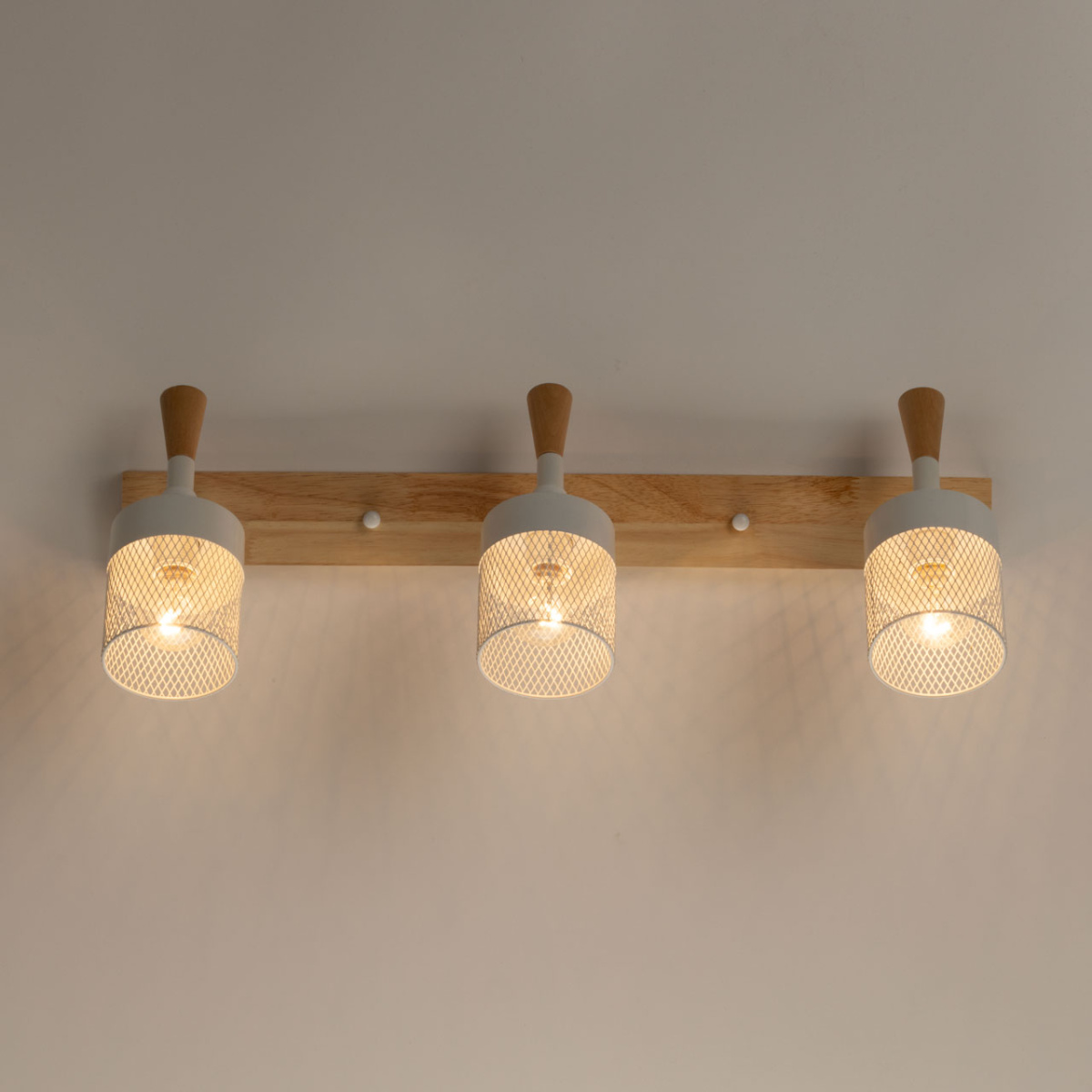Металлические основание и плафоны настенного бра окрашены в белый цвет. Элемент крепления к стене и декор выполнены из натурального дерева.