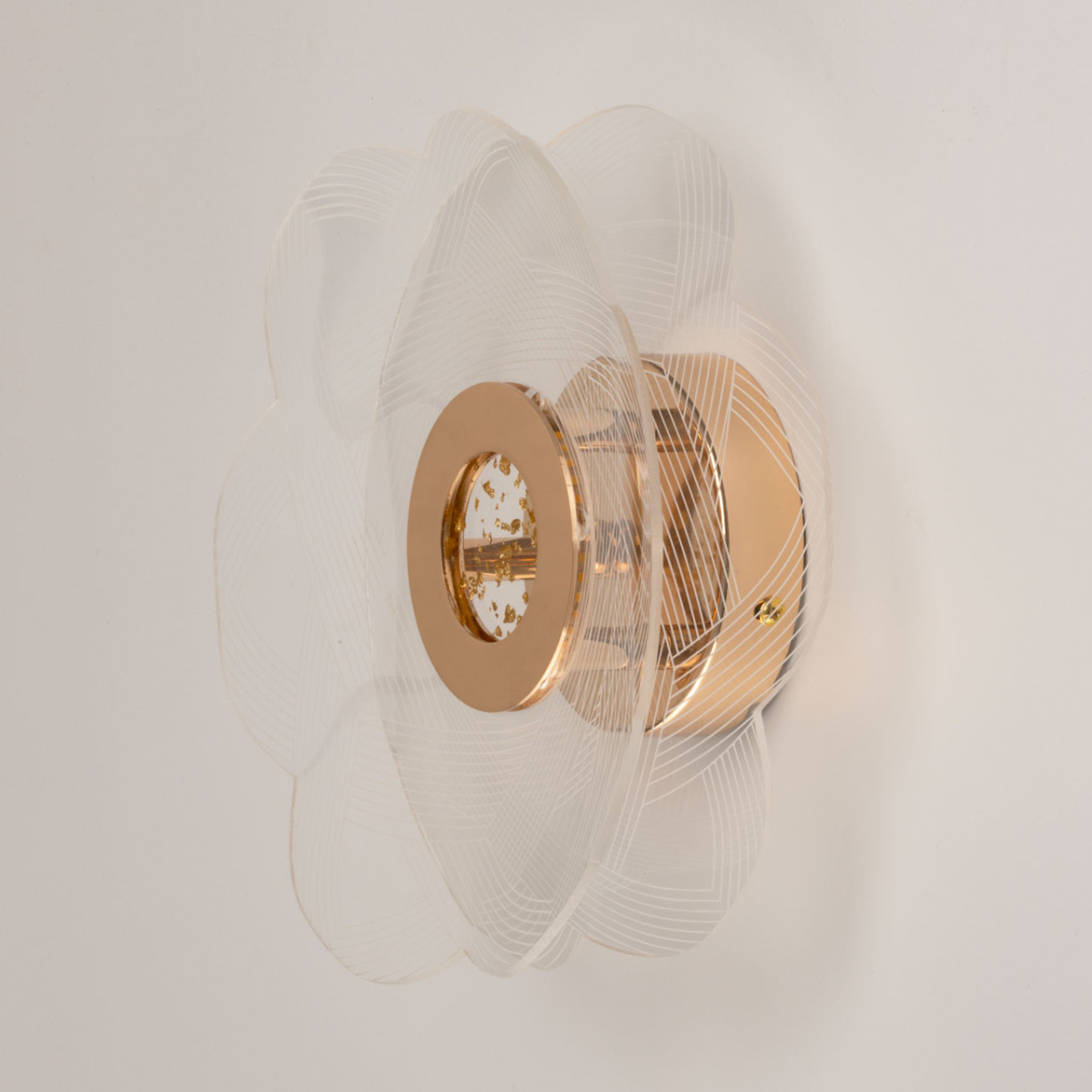 Металлическое основание потолочной люстры гальванизировано в цвет золота. Люстра декорирована прозрачным акрилом оригинальной формы с линейным рисунком.