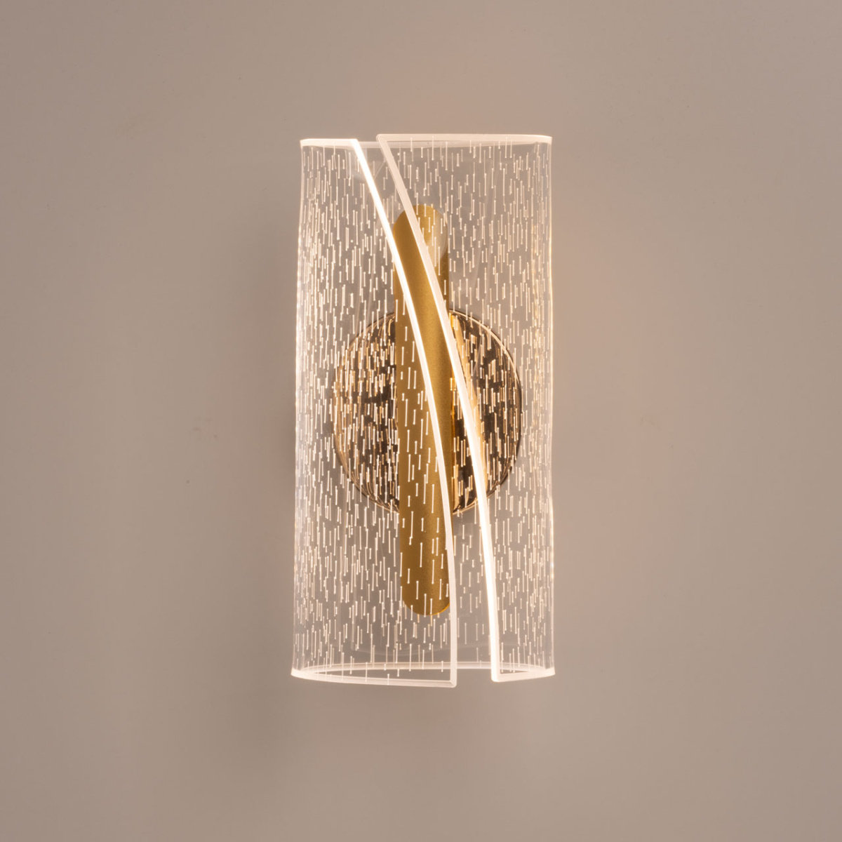 Металлический корпус настенного бра гальванизирован в цвет золота. Корпус плафона выполнен из сплава алюминия и окрашен в цвет золота. Настенное бра декорировано изящным элементом из прозрачного акрила с графичным рисунком.