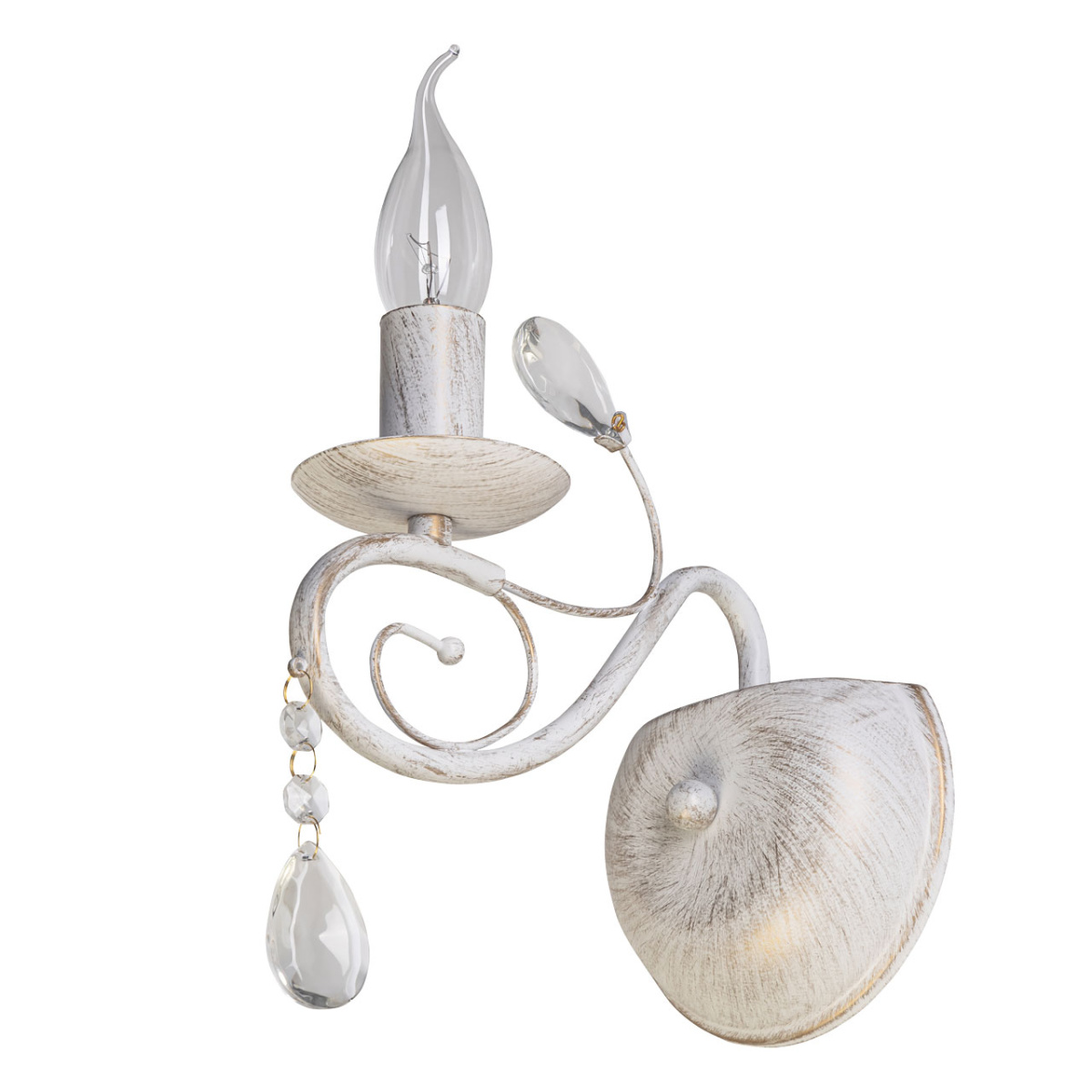 Металлическое основание светильника окрашено в белый цвет и обработано по технологии хай-лайт в золотой цвет. Настенное бра декорировано стеклянными подвесами миндалевидной формы.