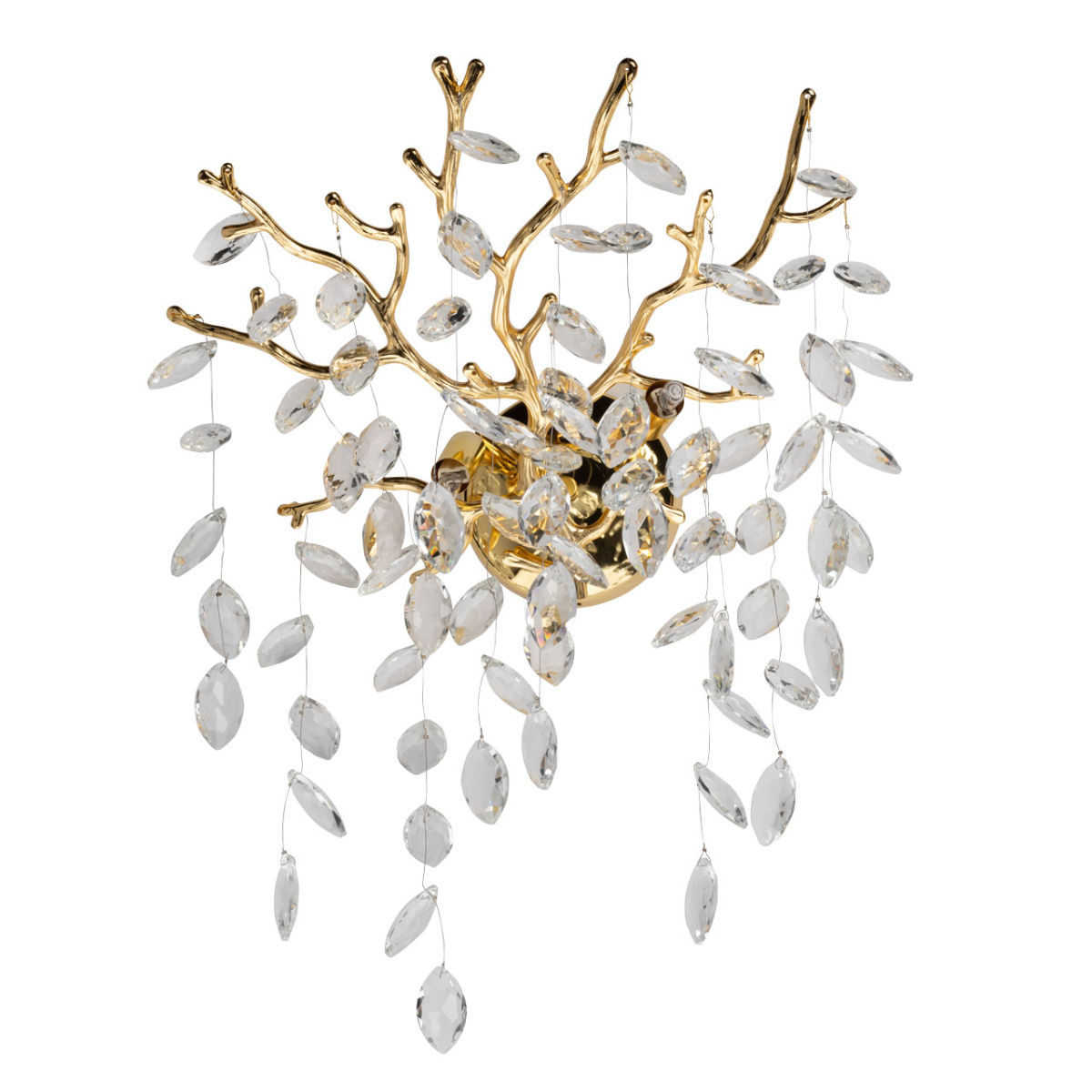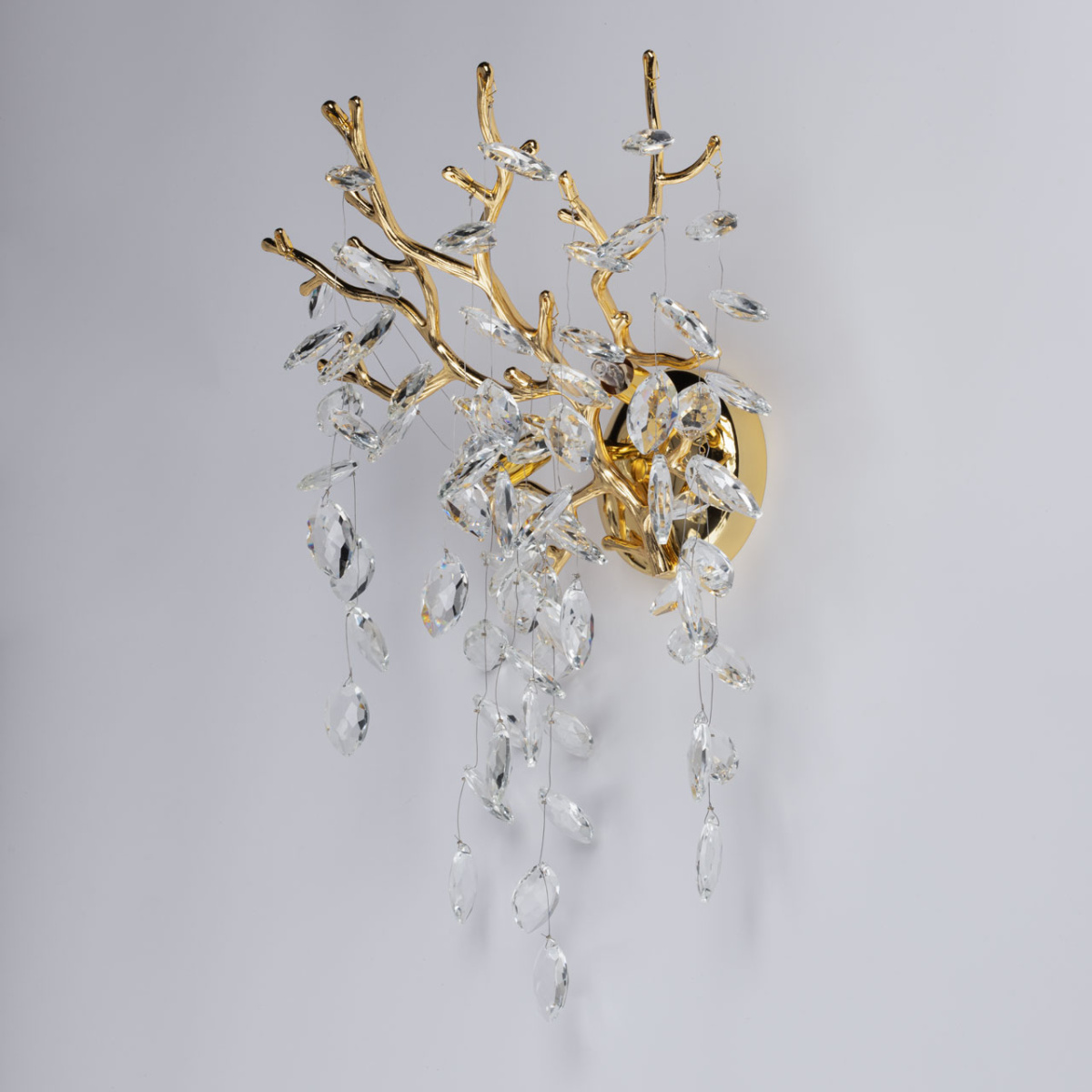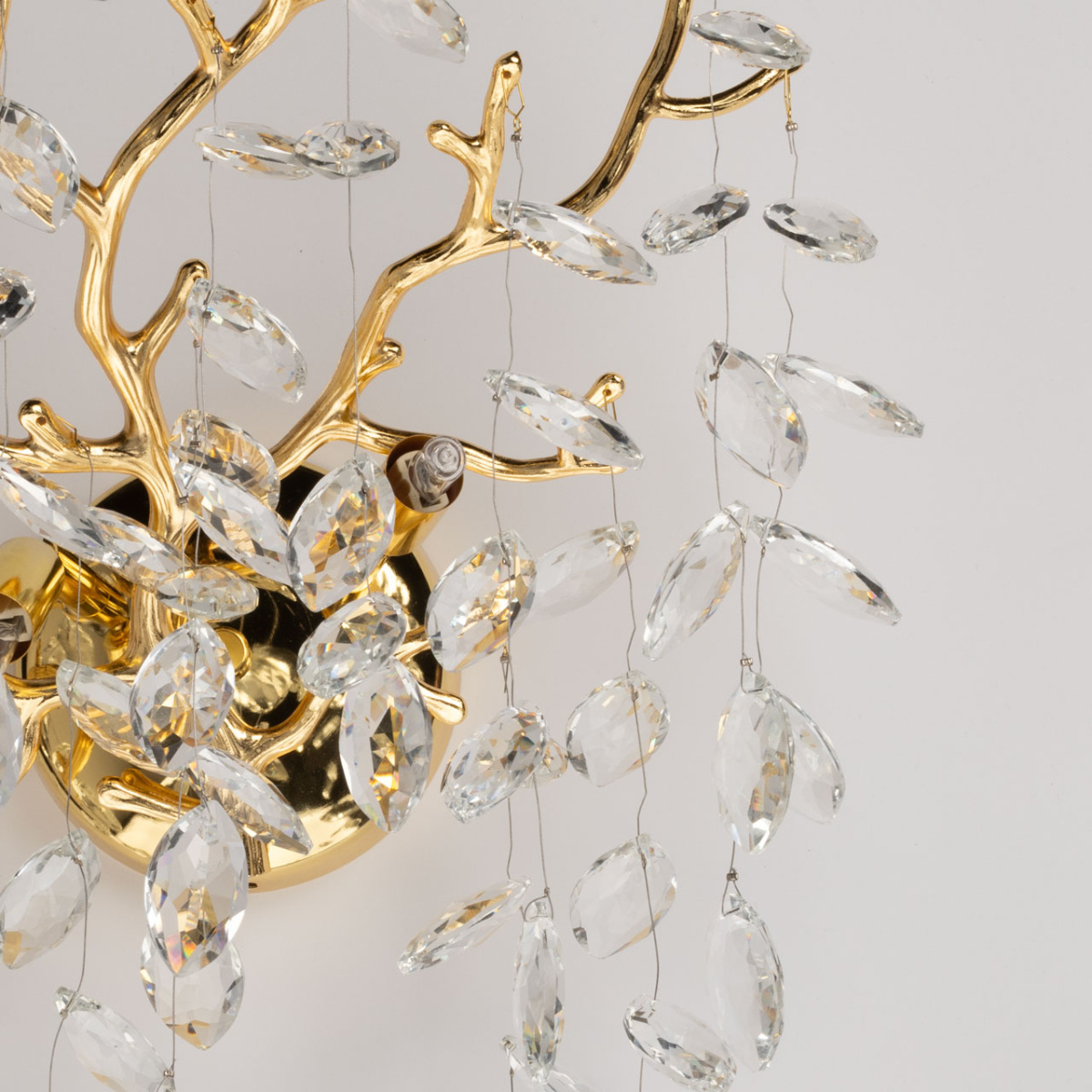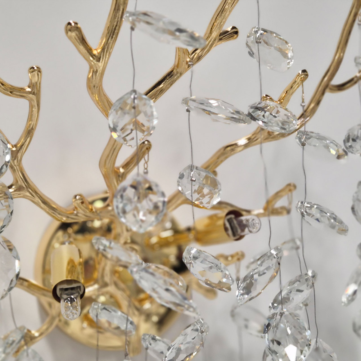 Основание настенного бра выполнено по технологии художественного литья из сплава алюминия с цинком и гальванизировано в цвет золота. Настенное бра декорировано подвесками из прозрачного хрусталя.