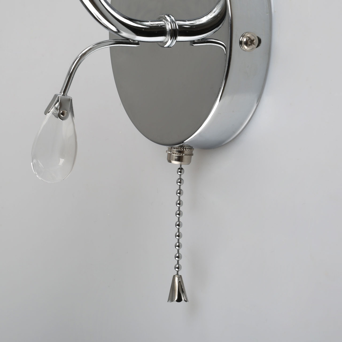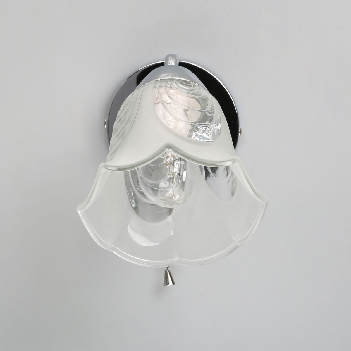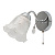 Металлическое основание гальванизировано в цвет хрома. Стеклянный плафон отлит в сложную форму и матирован. Светильник декорирован хрустальным стеклом миндалевидной формы.